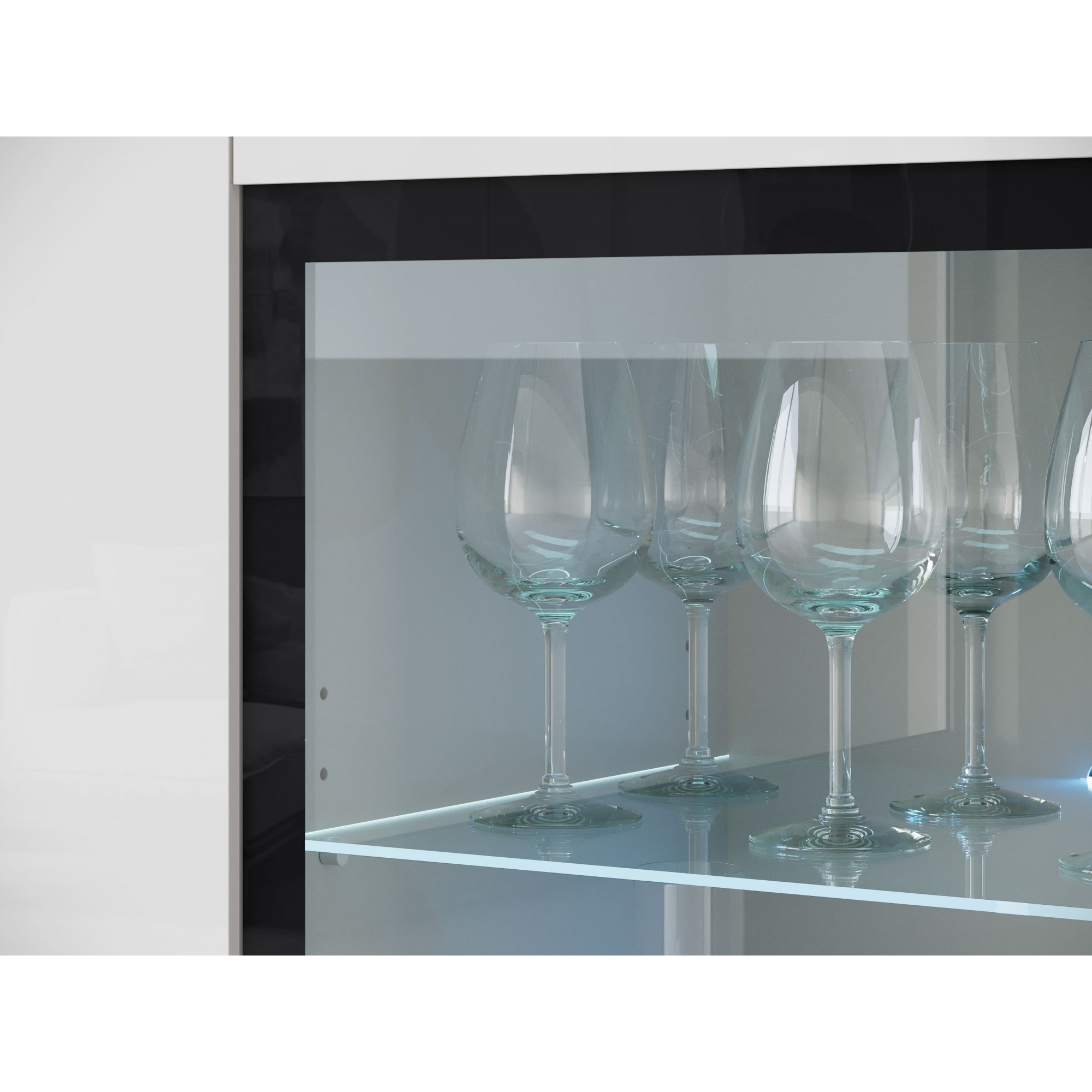 – Kommode aus 15 mm starker Schichtstoffplatte, Hochglanzfronten – Push-to-Open-System – Kanten mit ABS-Kante ummantelt – Teilweise lackiertes Glas – Glasböden (2 Stück) – Verstellbare Einlegeböden – Dezente silberne Kunststofffüße – Optional: LED-Beleuchtung (weiß, kalt) |
