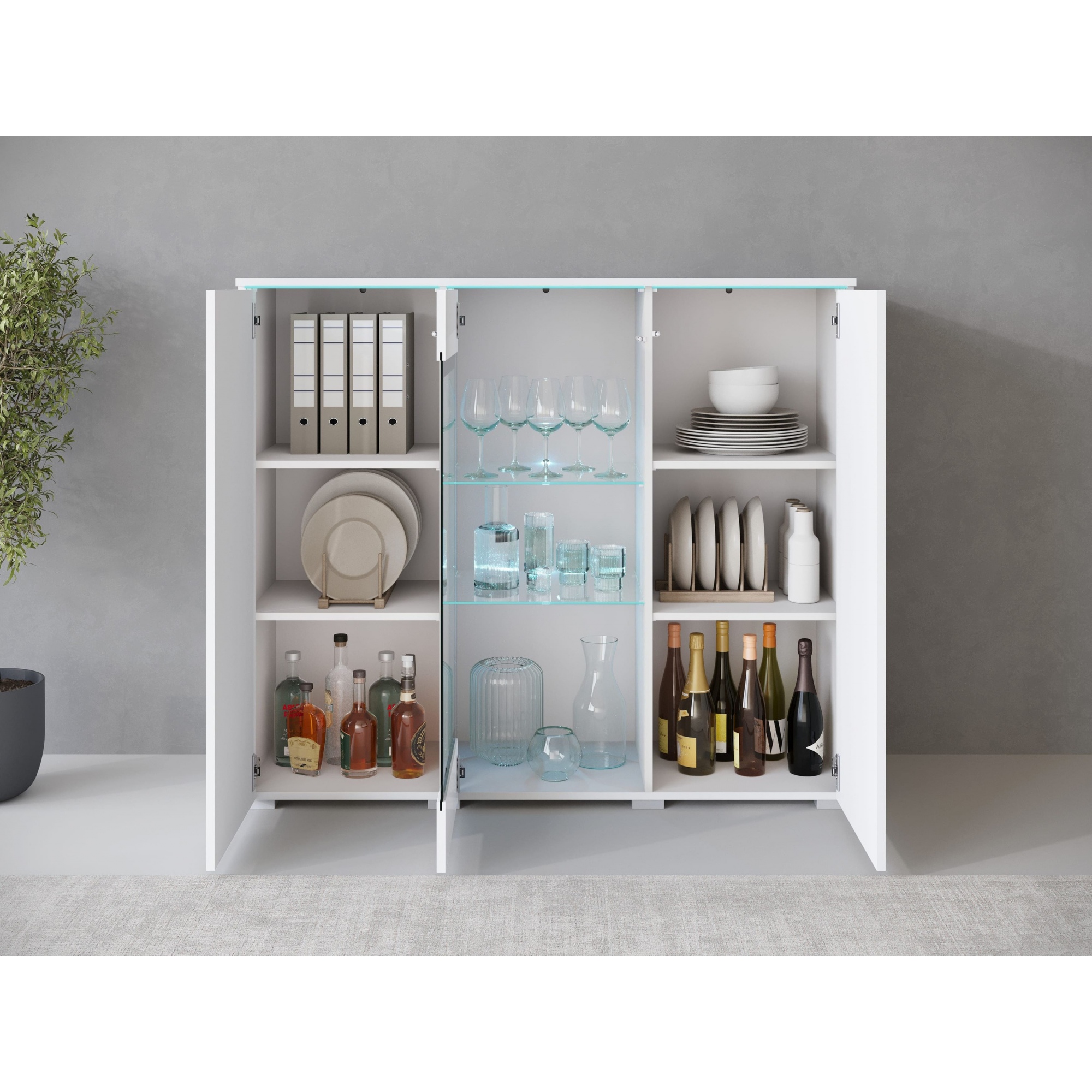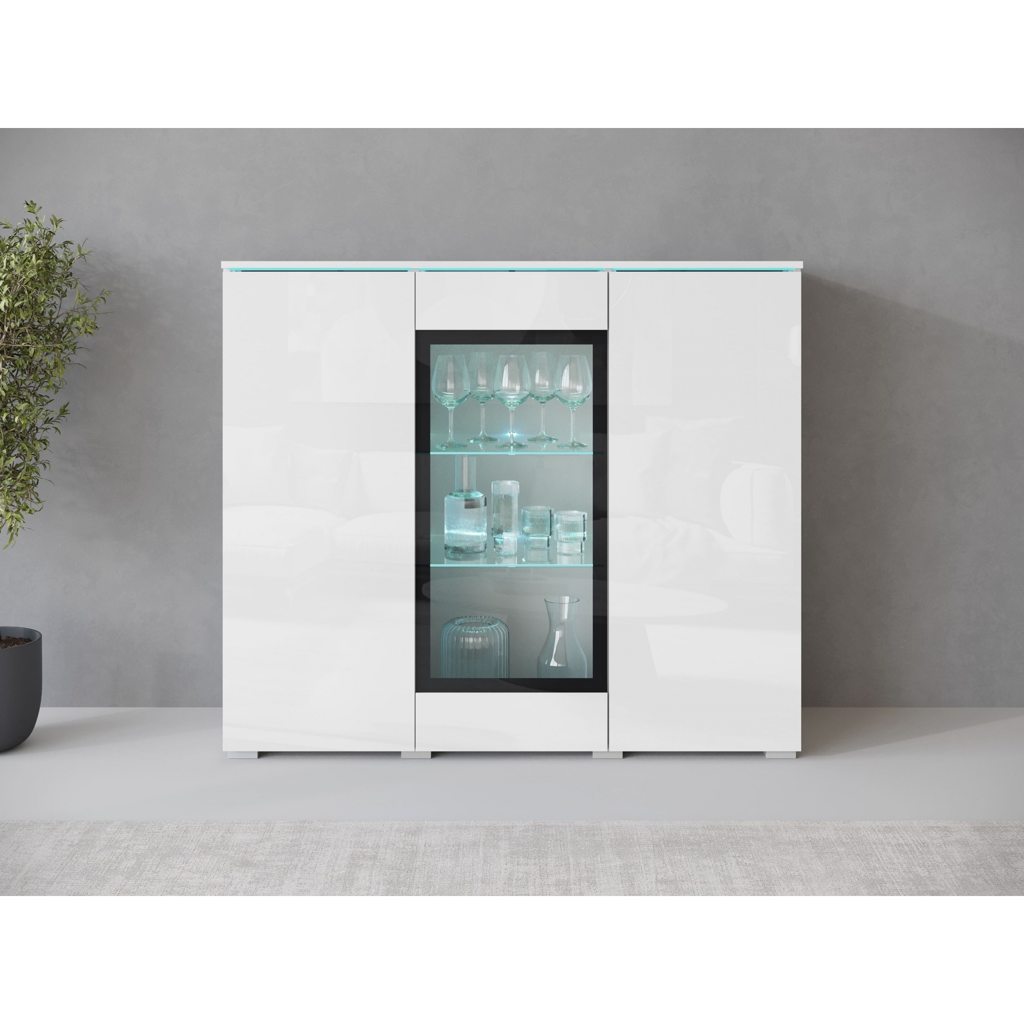 Eine funktionale Kommode, die Stauraum bietet und gleichzeitig als Sideboard im Esszimmer dient. Dank des Glases in der Mitte bietet die Kommode die Möglichkeit, Dekorationen, Geschirr oder Porzellan zu präsentieren. Die Seitenschränke hinter den durchgehenden Türfronten sind durch Einlegeböden unterteilt, sodass alles übersichtlich und schnell zugänglich ist. Alle Kommoden sind aus hochwertiger 15mm starker Schichtstoffplatte gefertigt, Fronten hochglänzend. Modell ohne Griffe, geöffnet mit „Push to Open“-System. Schubladenführungen - Rolle. Fronten und Korpussichtkanten mit ABS-Kante ummantelt. Der Einsatz zusätzlicher, optionaler LED-Beleuchtung verschönert viele Innenräume und der visuelle Effekt wird alle Gäste begeistern. |