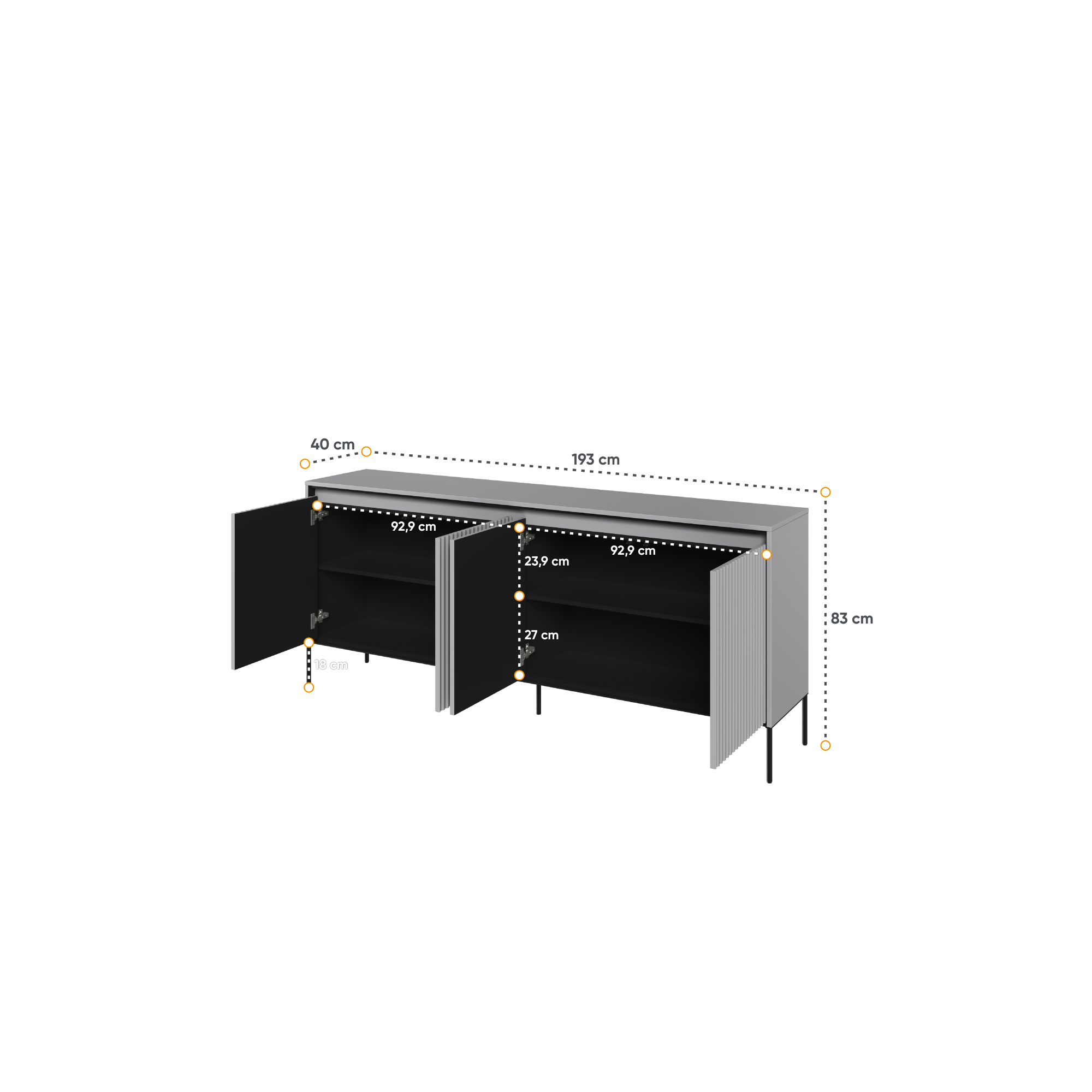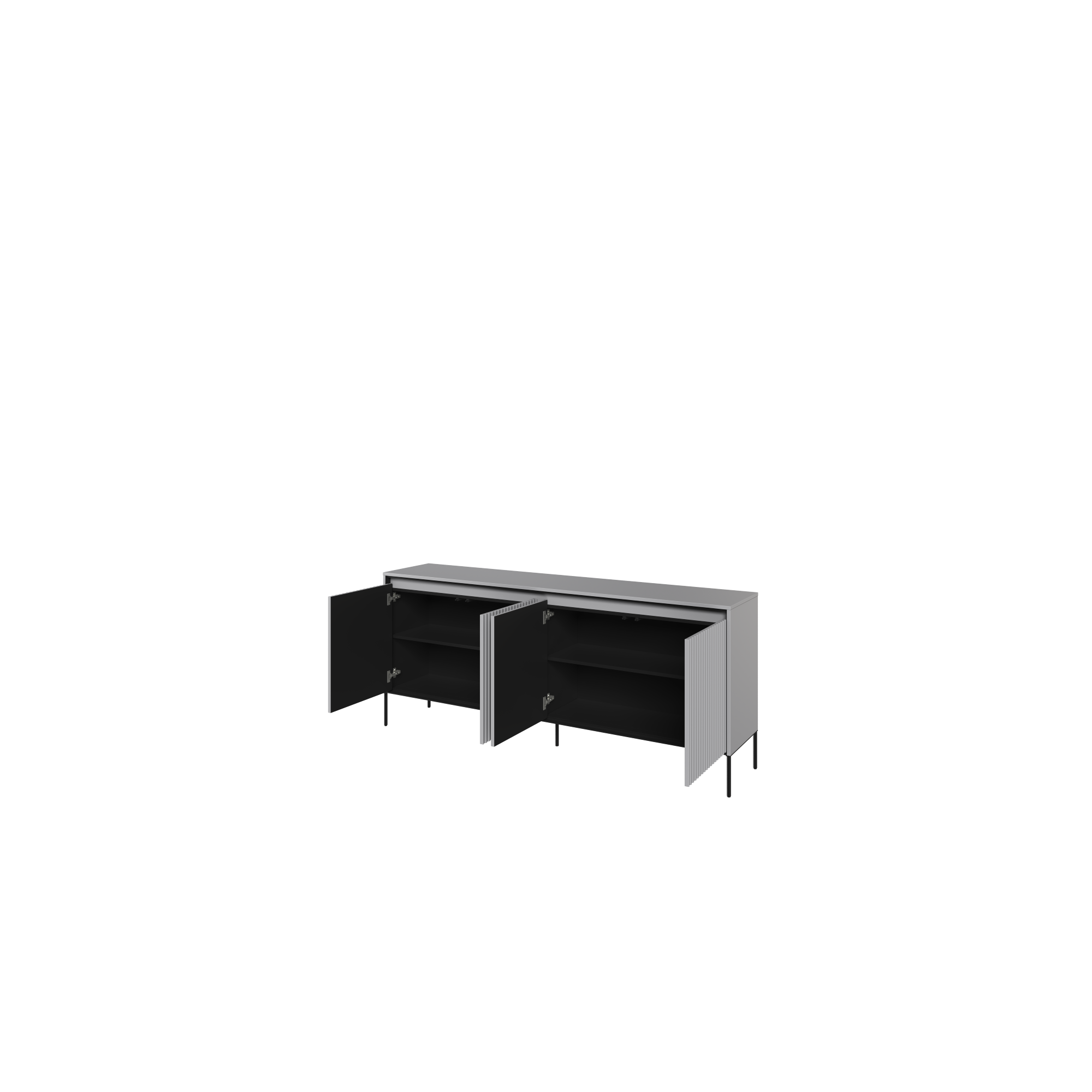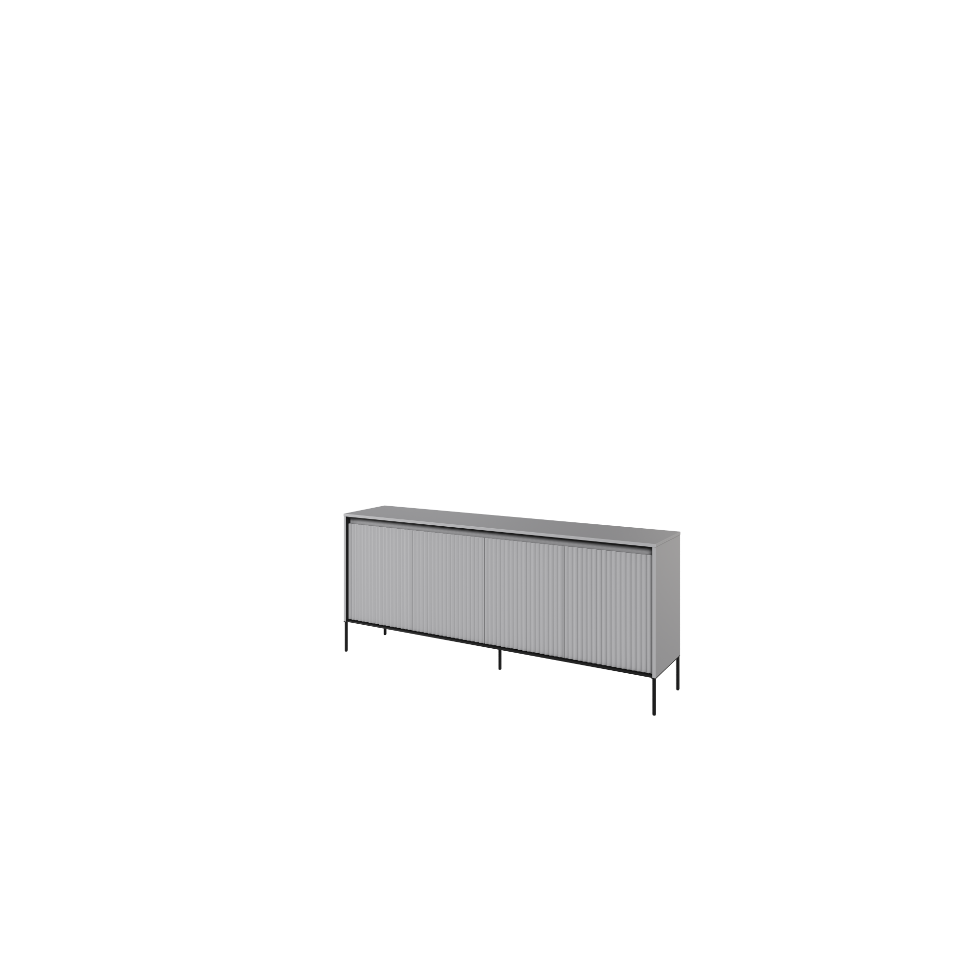 Diese Kommode hat vier Türen mit einer regelmäßigen Form, die einen interessanten Akzent setzt. Eines der auffälligsten Elemente ist die elegante Riffelung der Fronten, die durch die LED-Beleuchtung hervorgehoben wird. Die breite Oberseite der Kommode kann als Ausstellungsfläche für Ornamente oder andere Dekorationen genutzt werden und verleiht Ihrer Einrichtung noch mehr Charme. Das „push to open“-System erleichtert die Nutzung der Kommode.