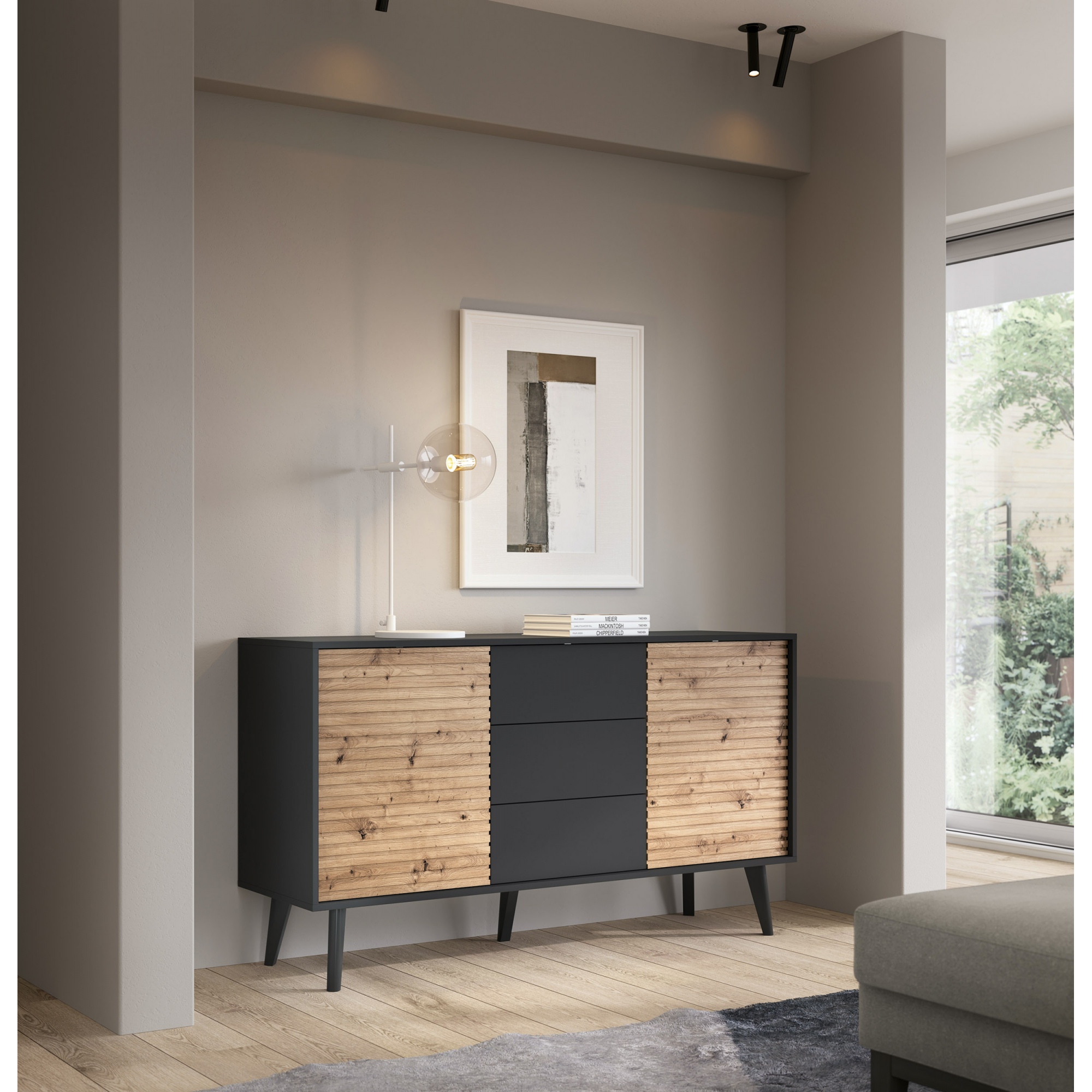 Eine breite Kommode mit drei geräumigen Schubladen und zwei Einlegeböden, die sich hinter MDF-Fronten verbergen. Ideal für ein Zimmer oder ein Wohnzimmer. Die mattschwarze Farbe des Schranks, kombiniert mit der dekorativen Front aus Artisan-Eiche, verleiht dem Möbel einen interessanten Look. Das zeitlose 3D-Muster der horizontalen Lamellen ist ein Blickfang. Gönnen Sie sich ein gemütliches Interieur wie aus den Titelseiten von Top-Magazinen. |