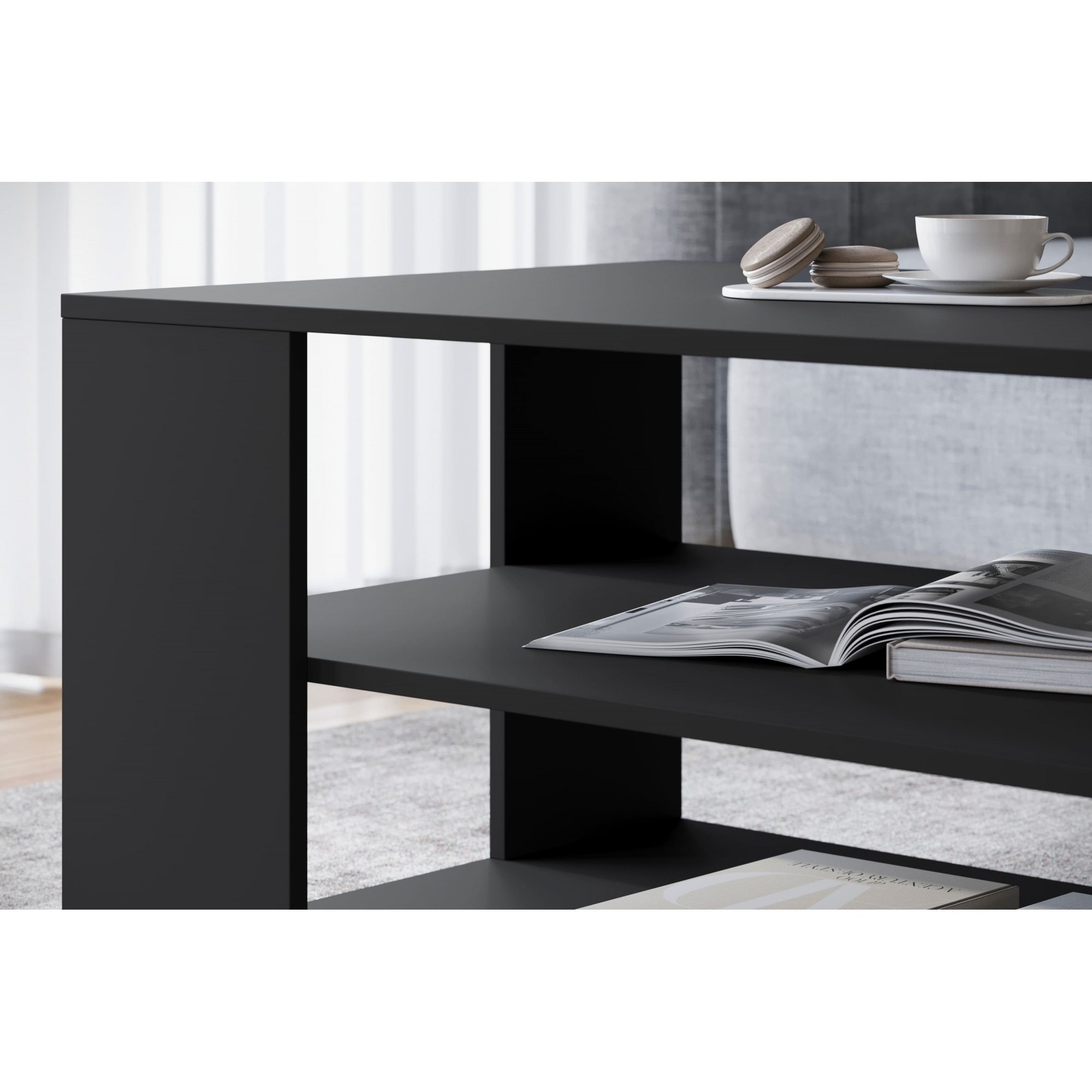 Das horizontale Design des Tisches bietet nicht nur ein ästhetisches Aussehen, sondern auch eine praktische Lösung für die Aufbewahrung von Büchern oder den wichtigsten Dingen, die Sie immer zur Hand haben wollen.