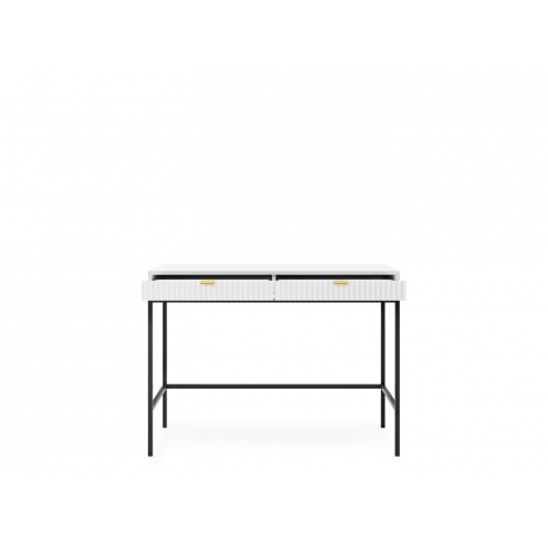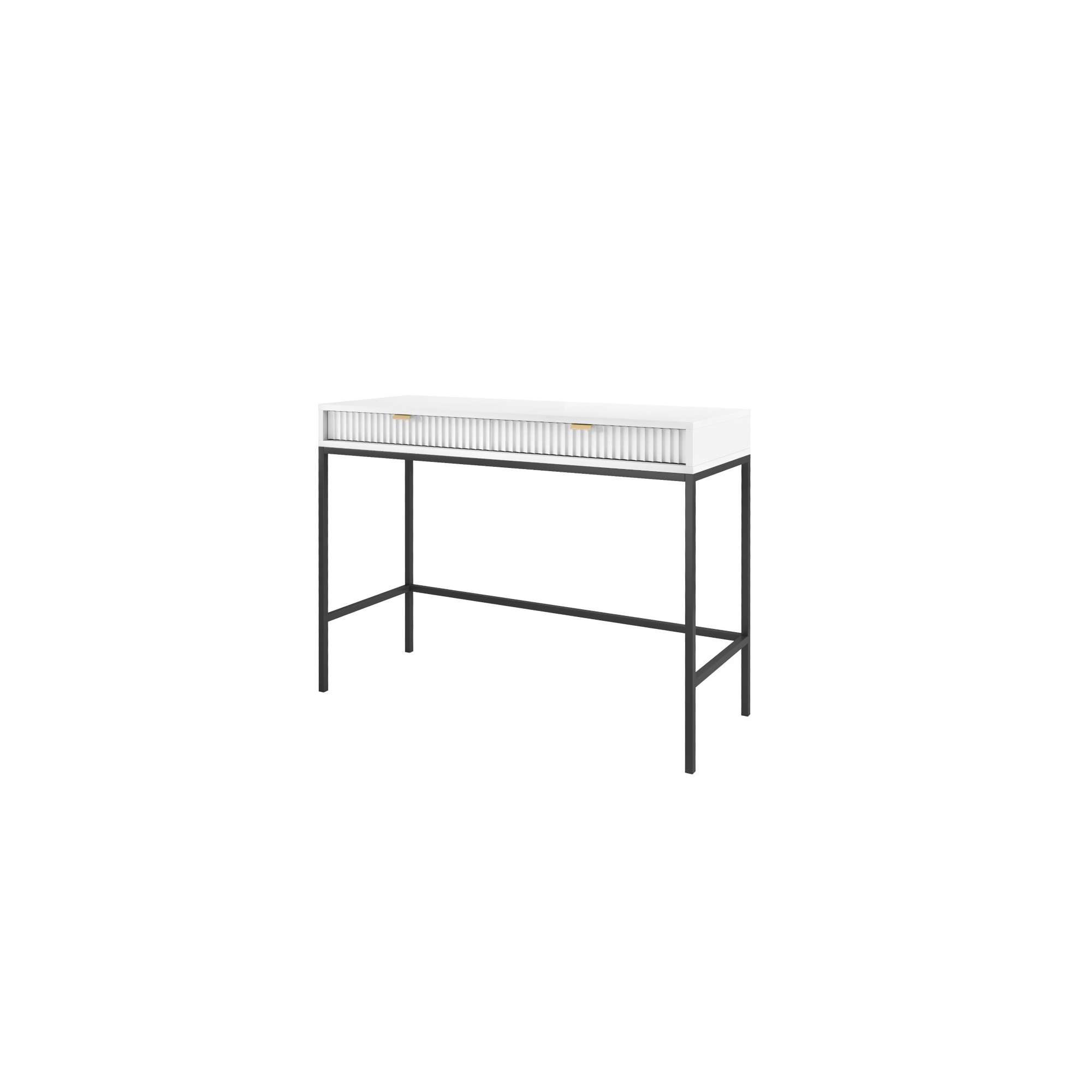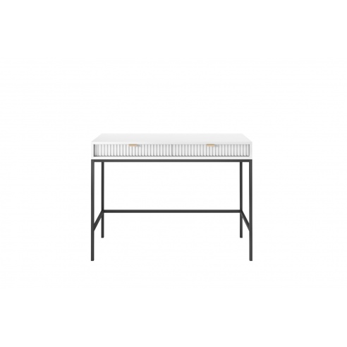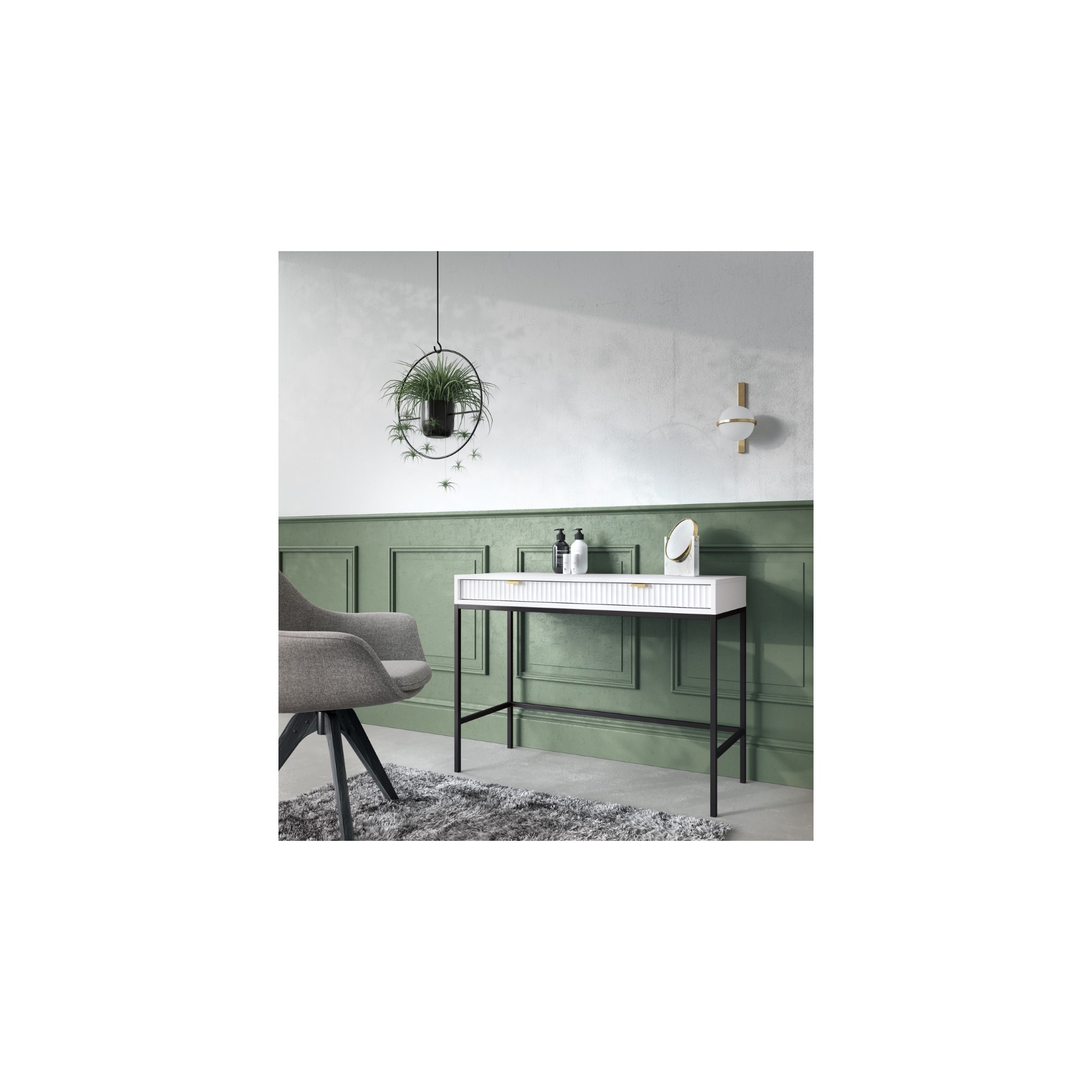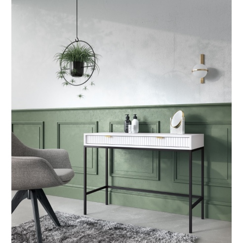 Moderner Schminktisch mit Schubladen. Ein Möbelstück, das sich ideal für das Büro als Schreibtisch oder das Schlafzimmer als Schminktisch eignet. Die Farbe in Kombination mit den dekorativen MDF-Fronten verleiht dem Möbelstück einen interessanten Look. Bei den individuellen Details wie den Griffen und der Farbe der Beine können Sie Ihrer Fantasie freien Lauf lassen. Stellen Sie sich die Einrichtung Ihres Zuhauses wie auf den Titelseiten der besten Zeitschriften vor.
