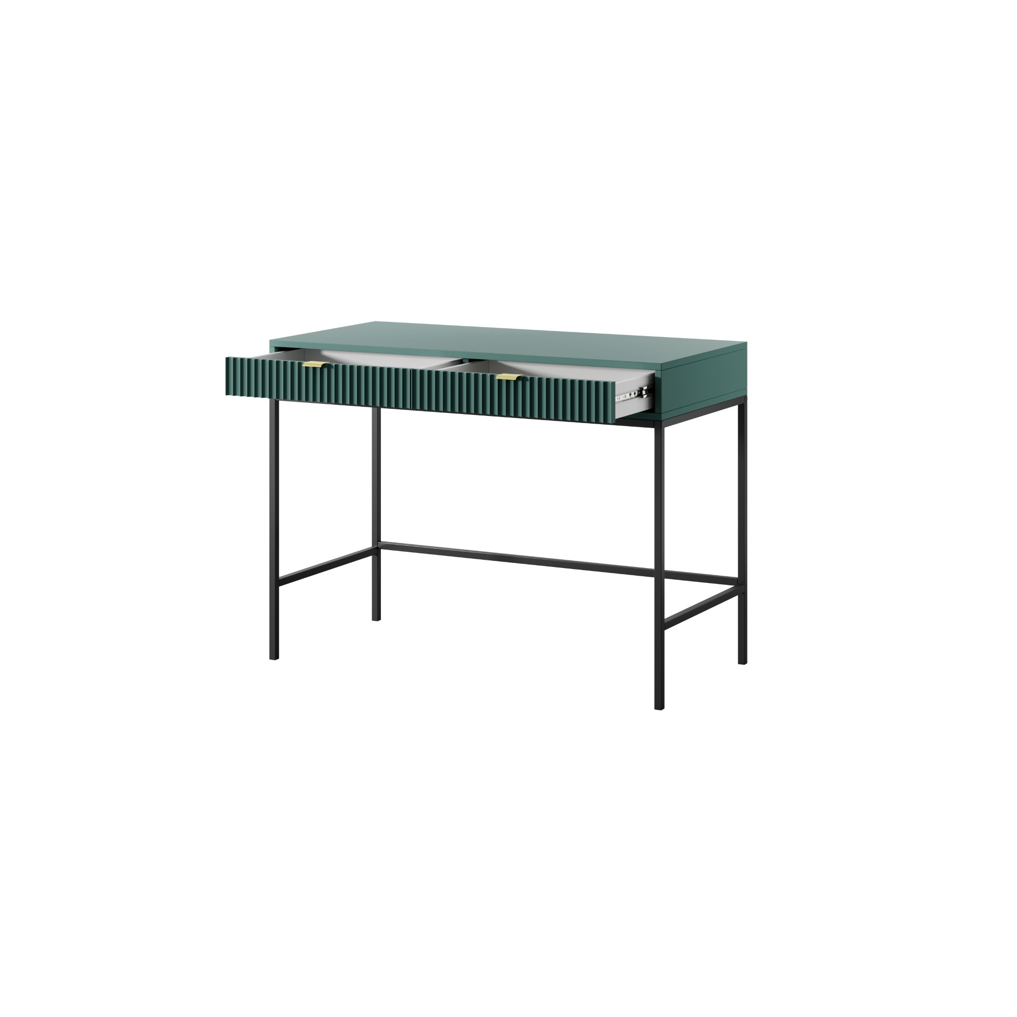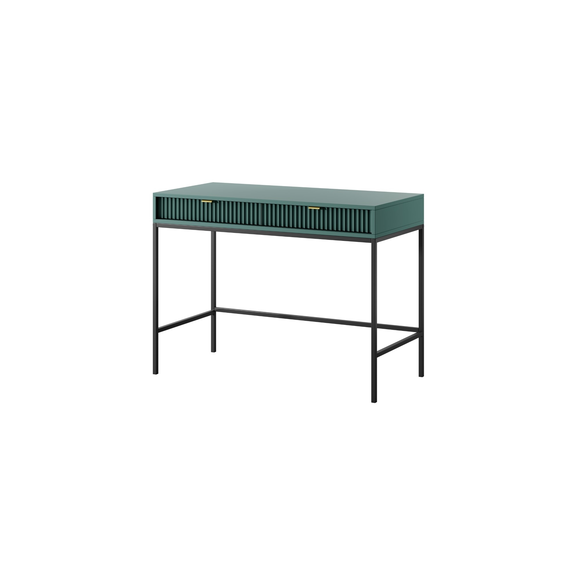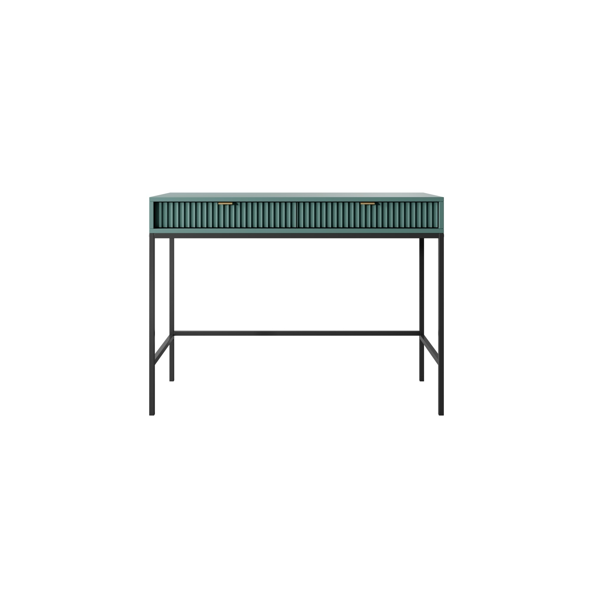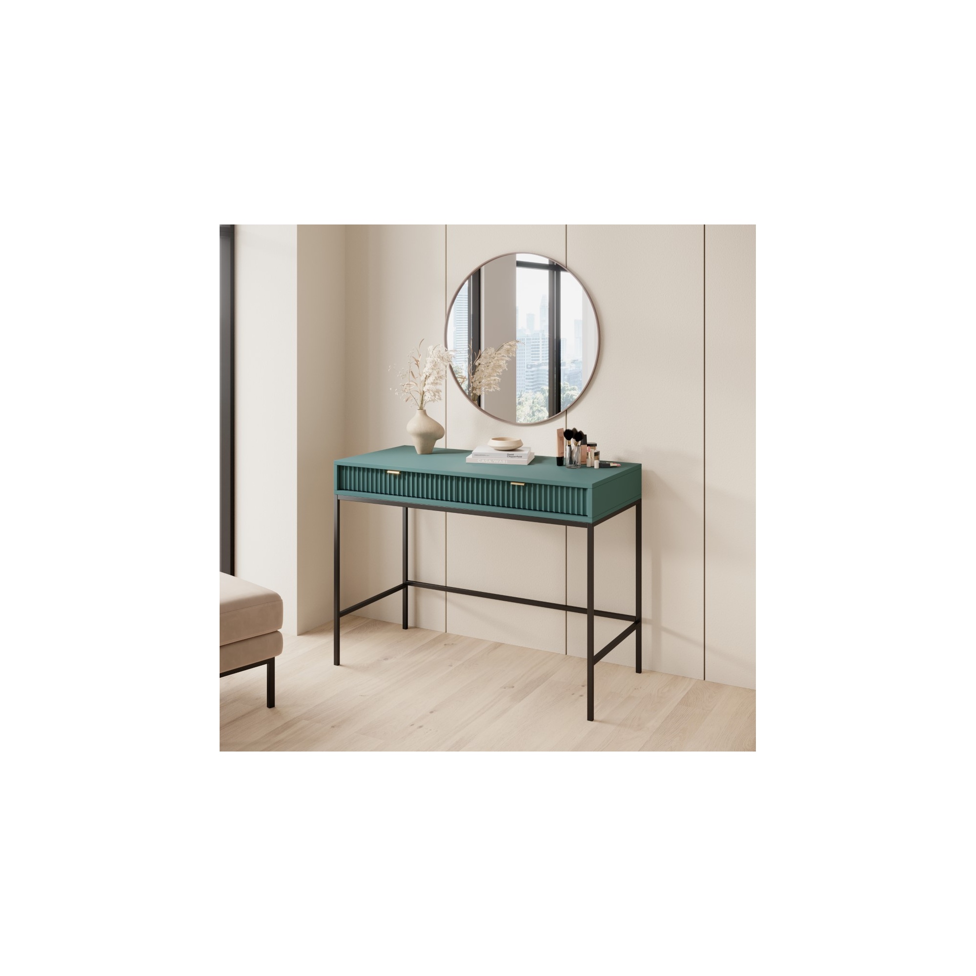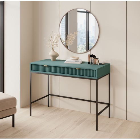 Moderner Schminktisch mit Schubladen. Ein Möbelstück, das sich ideal für das Büro als Schreibtisch oder das Schlafzimmer als Schminktisch eignet. Die Farbe in Kombination mit den dekorativen MDF-Fronten verleiht dem Möbelstück einen interessanten Look. Bei den individuellen Details wie den Griffen und der Farbe der Beine können Sie Ihrer Fantasie freien Lauf lassen. Stellen Sie sich die Einrichtung Ihres Zuhauses wie auf den Titelseiten der besten Zeitschriften vor.