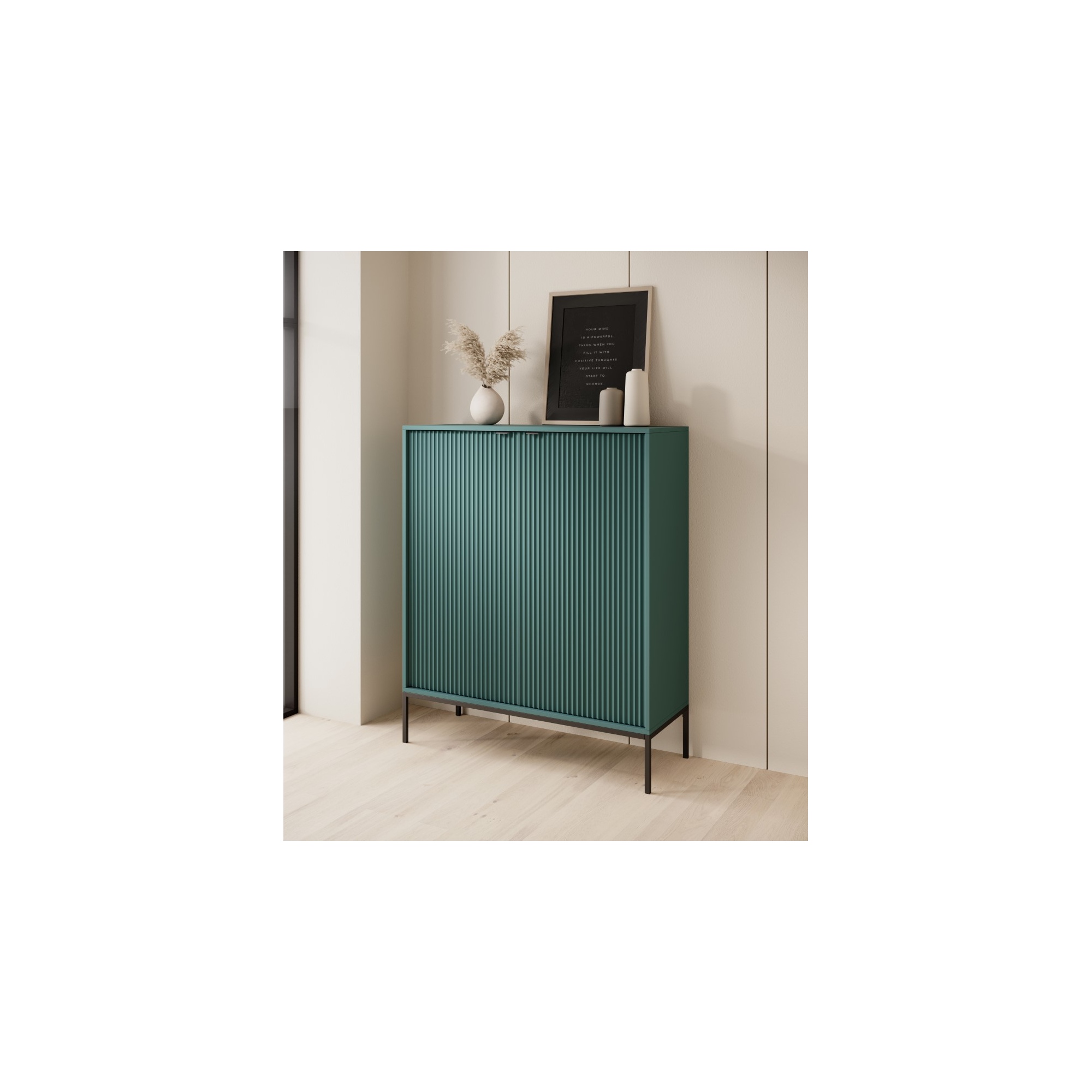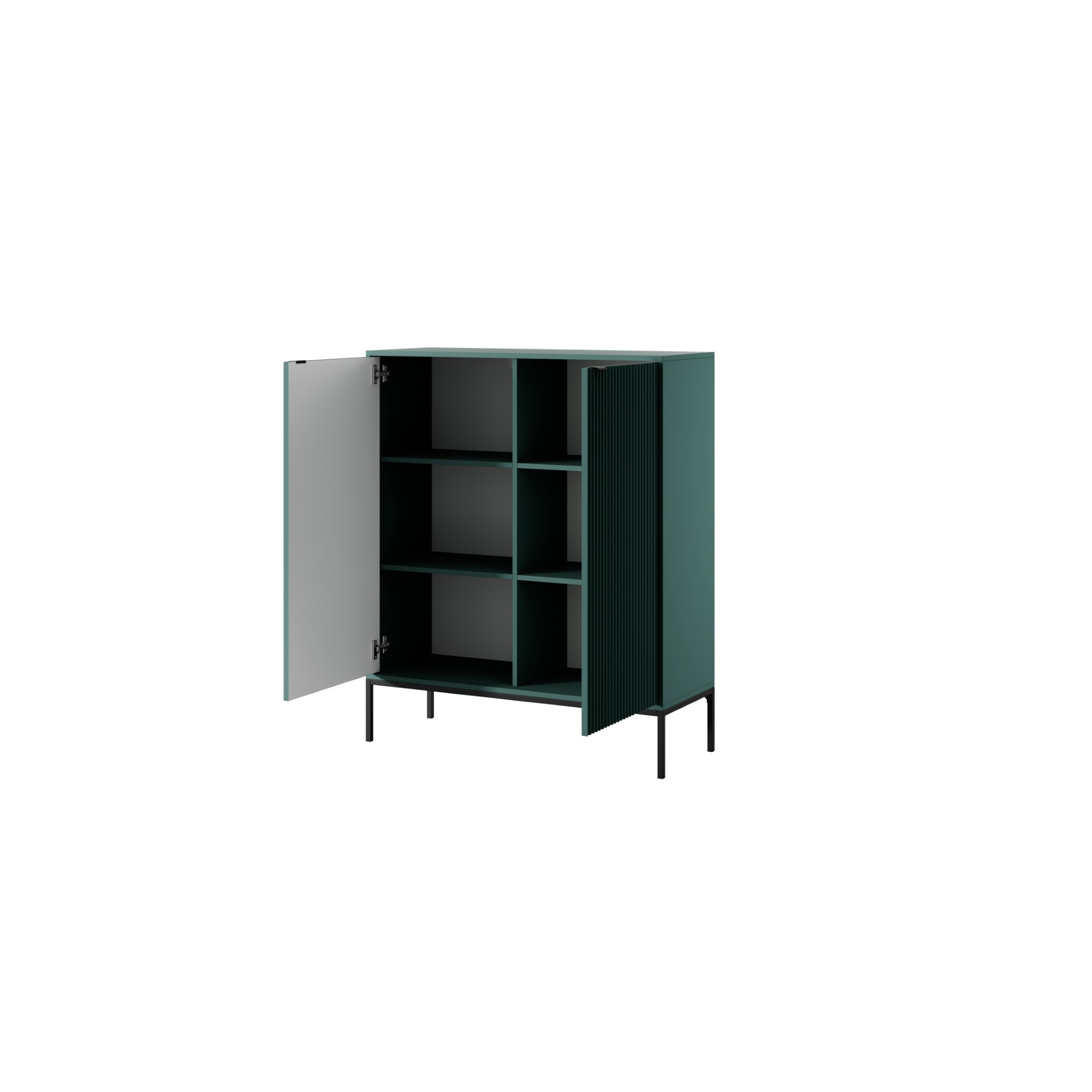Moderne hohe Kommode mit Türen. Ideal für ein Zimmer oder ein Wohnzimmer. Die Farbe der Kommode in Kombination mit der dekorativen MDF-Front verleiht dem Möbel einen interessanten Look. Mit individuellen Details wie den Griffen und der Farbe der Beine können Sie Ihrer Fantasie freien Lauf lassen. Stellen Sie sich die Einrichtung Ihres Hauses wie auf den Titelseiten der besten Zeitschriften vor.