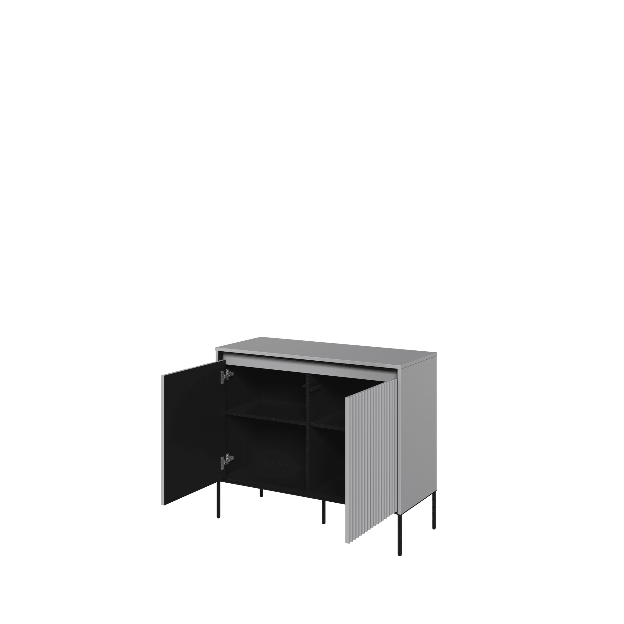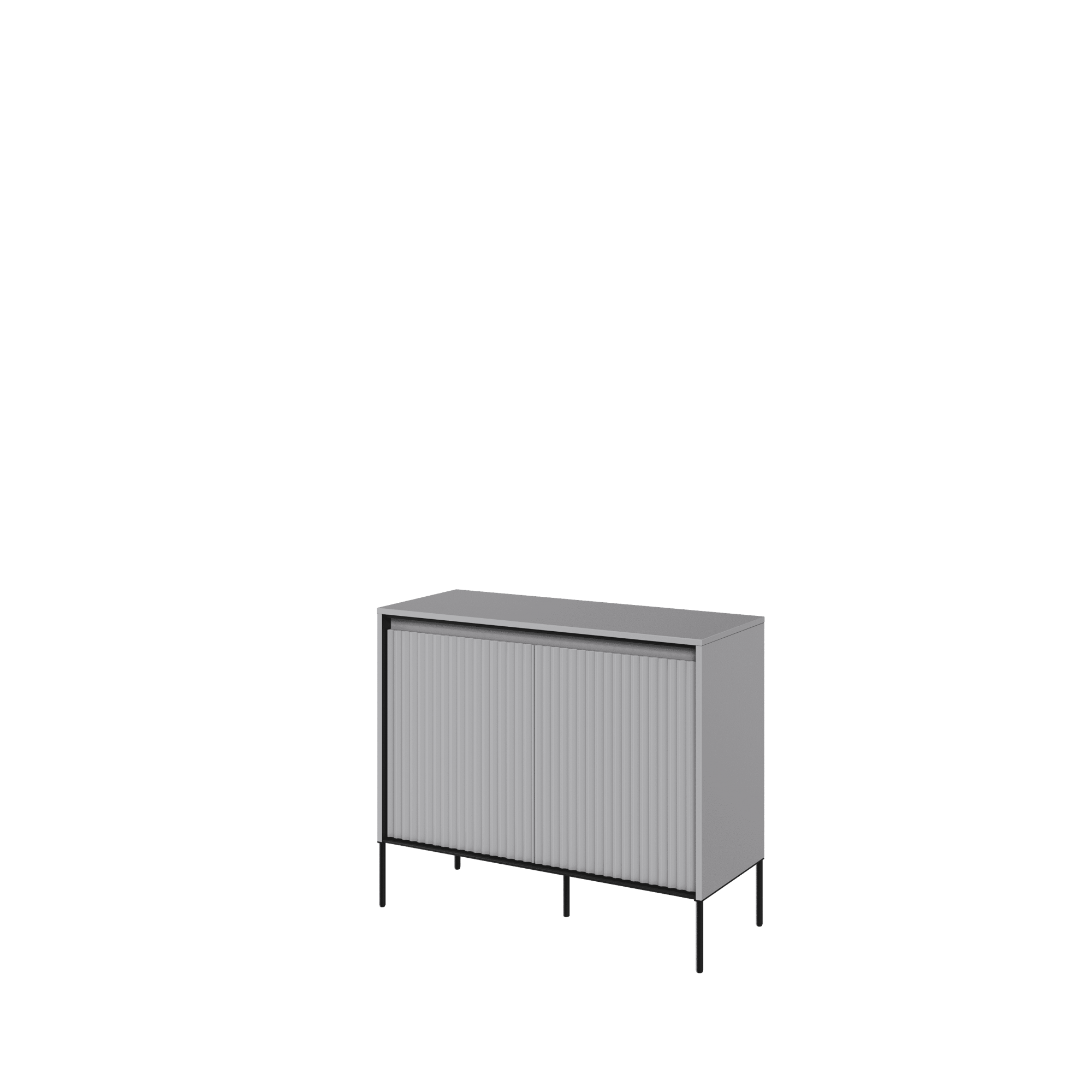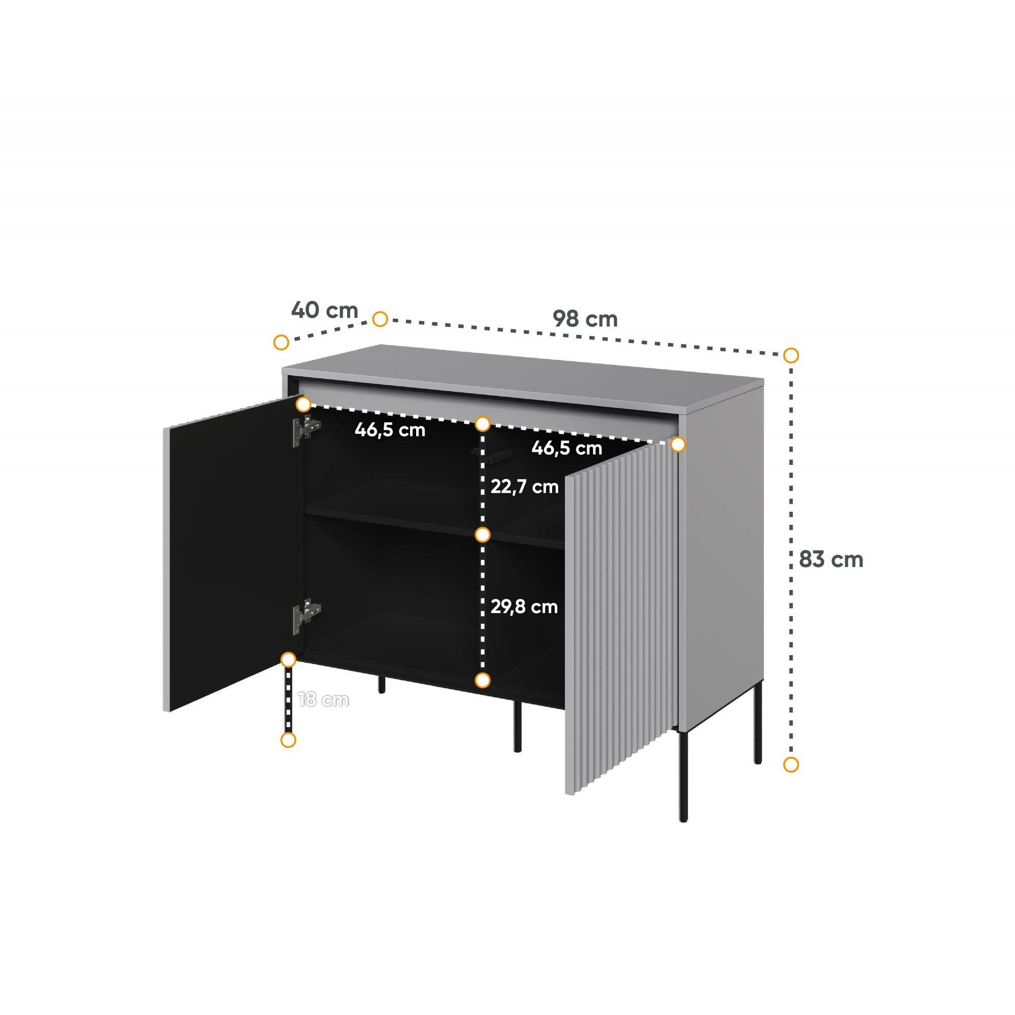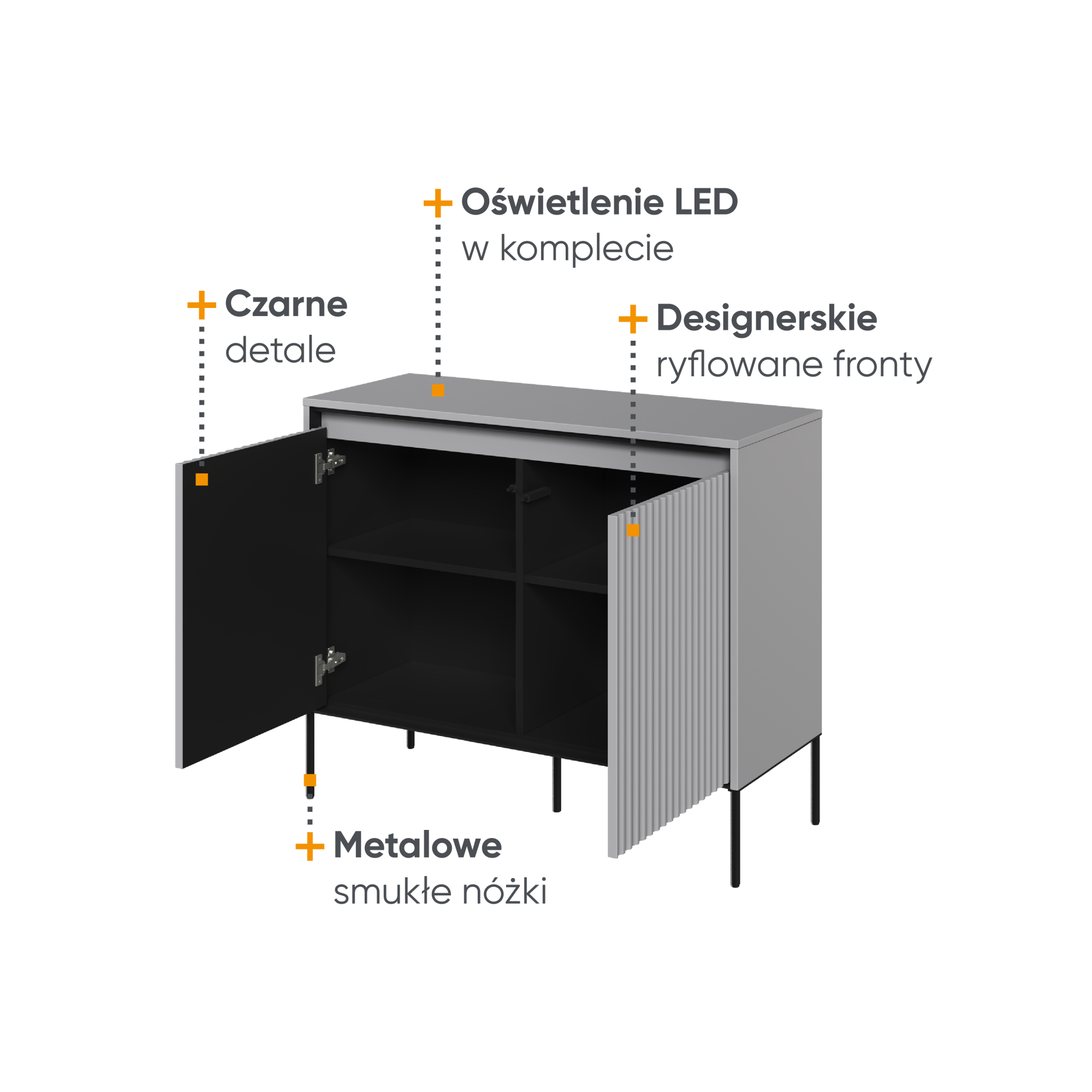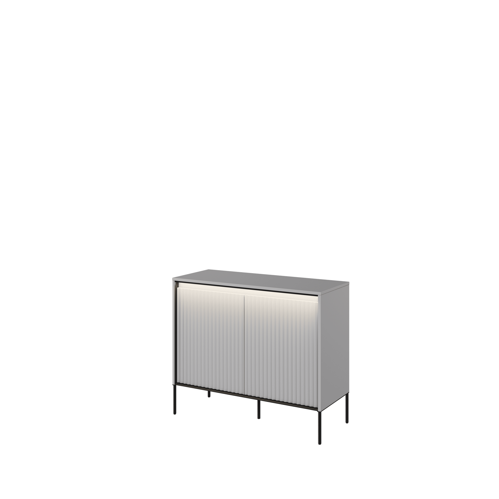 Diese Kommode hat zwei Türen, hinter denen sich zwei Einlegeböden befinden, in denen Sie Ihre Utensilien unterbringen können. Diese Kommode ist mit ihrem einzigartigen Stil ein echter Blickfang, und dank der breiten Farbpalette können Sie sie mit Sicherheit an Ihr Wohn- oder Schlafzimmerdekor anpassen. Eines der auffälligsten Elemente ist die elegante Riffelung der Fronten, die durch die LED-Beleuchtung noch verstärkt wird. Die Oberseite der Kommode kann als Ablagefläche für Ornamente oder andere Dekorationen genutzt werden. Das „push to open“-System erleichtert den täglichen Gebrauch der Kommode erheblich.