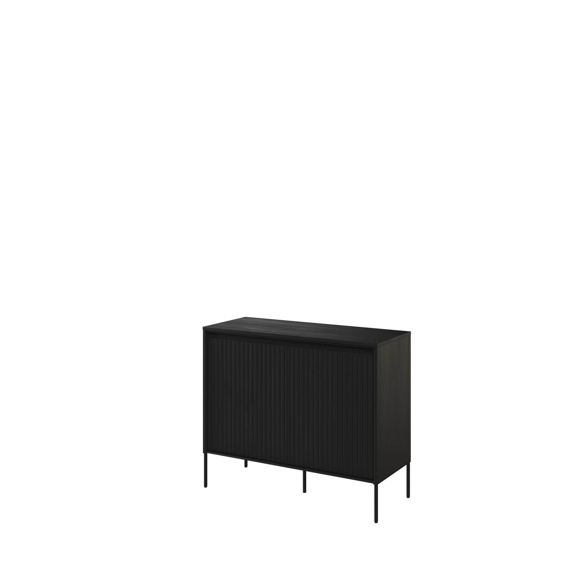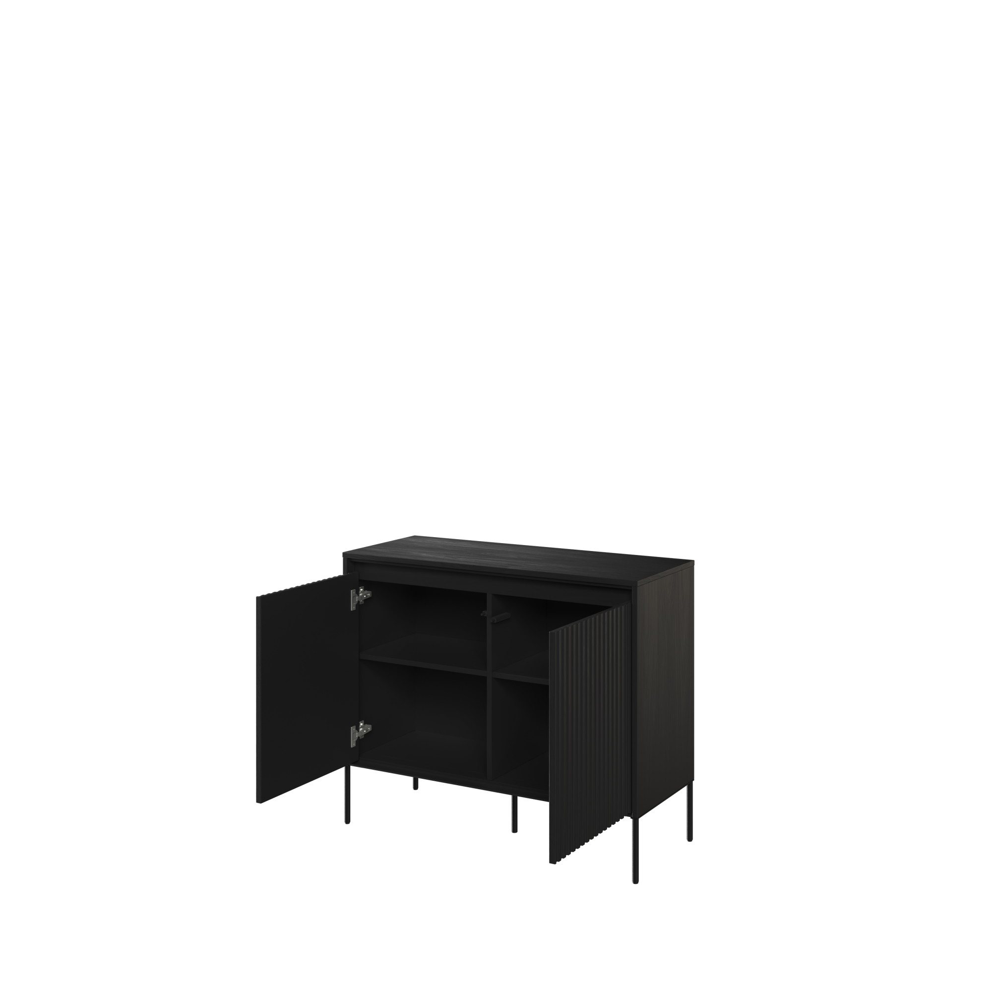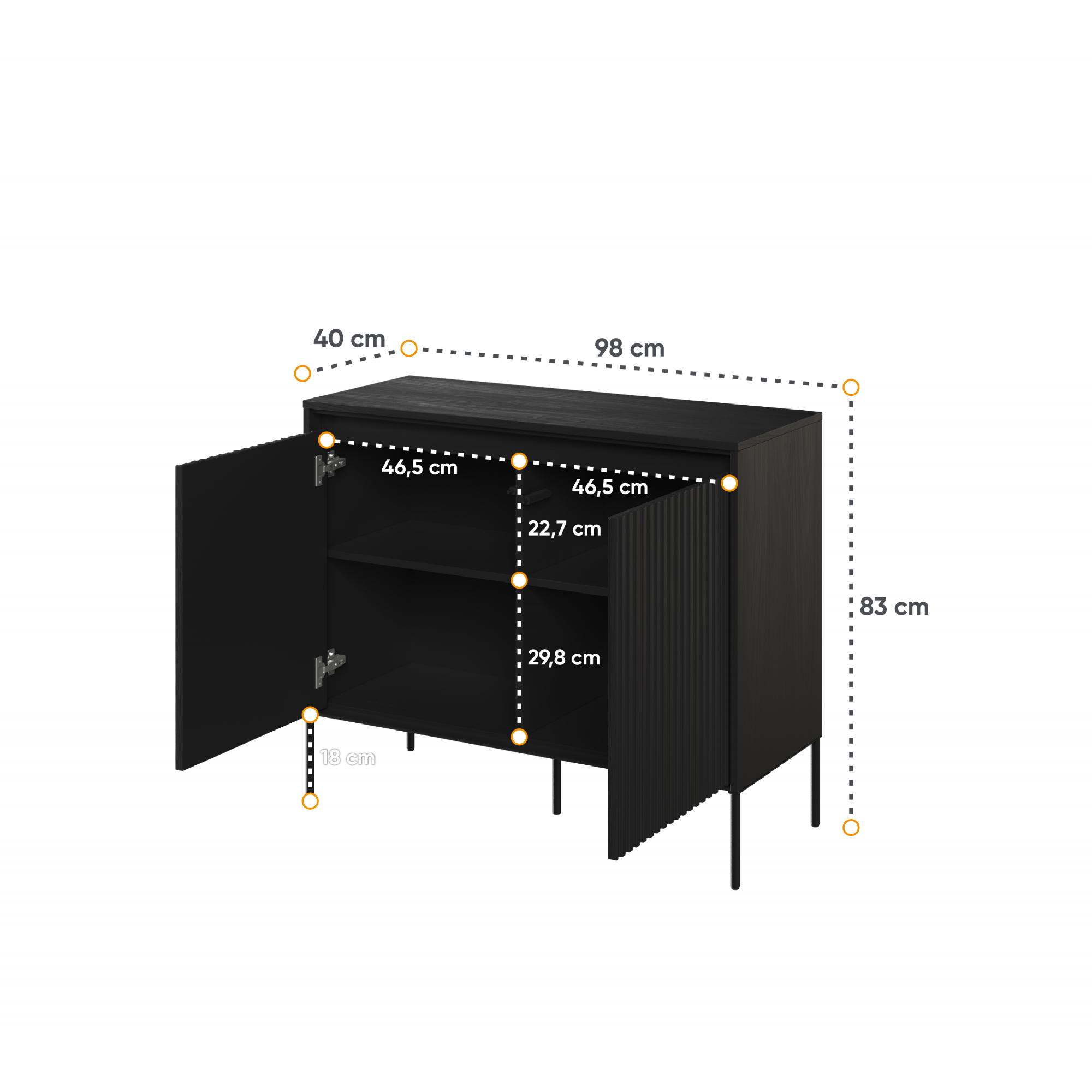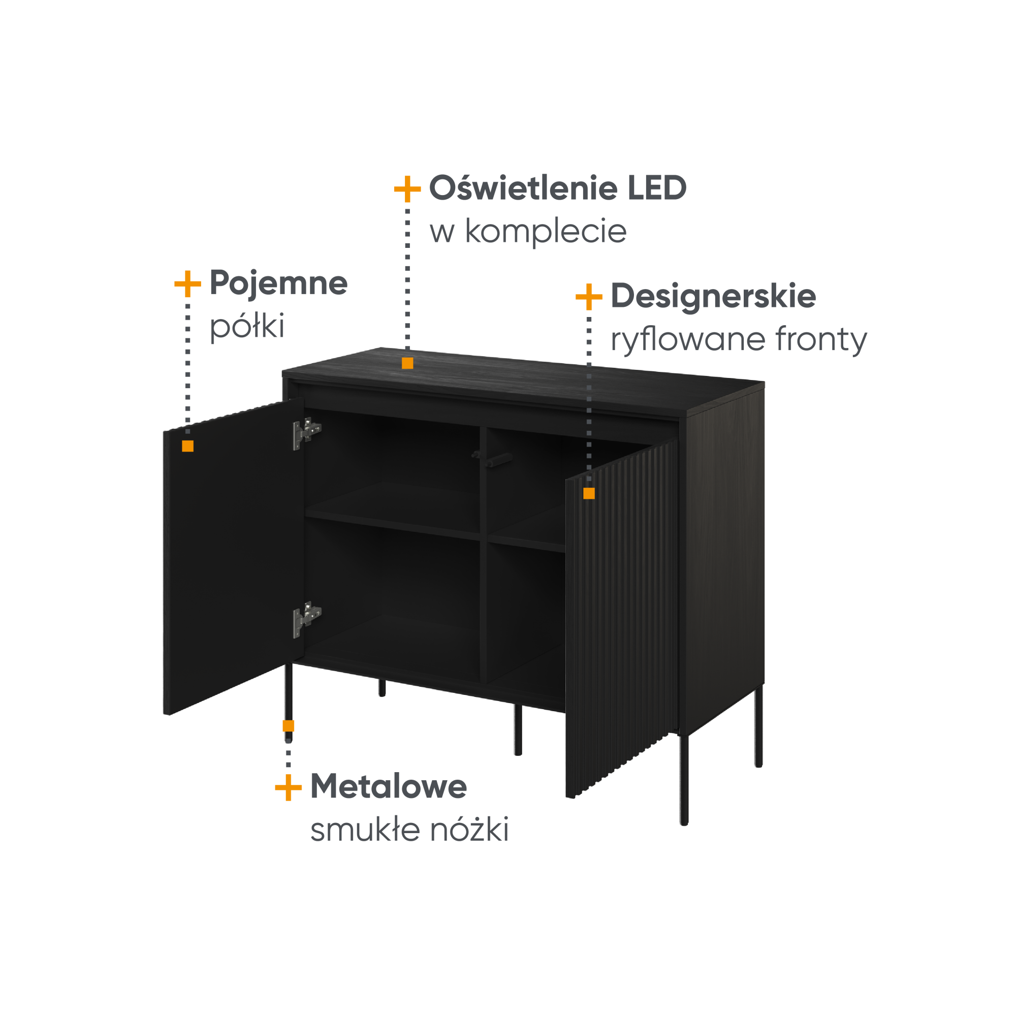 Diese Kommode hat zwei Türen, hinter denen sich zwei Einlegeböden befinden, in denen Sie Ihre Utensilien unterbringen können. Diese Kommode ist mit ihrem einzigartigen Stil ein echter Blickfang, und dank der breiten Farbpalette können Sie sie mit Sicherheit an Ihr Wohn- oder Schlafzimmerdekor anpassen. Eines der auffälligsten Elemente ist die elegante Riffelung der Fronten, die durch die LED-Beleuchtung noch verstärkt wird. Die Oberseite der Kommode kann als Ablagefläche für Ornamente oder andere Dekorationen genutzt werden. Das „push to open“-System erleichtert den täglichen Gebrauch der Kommode erheblich.