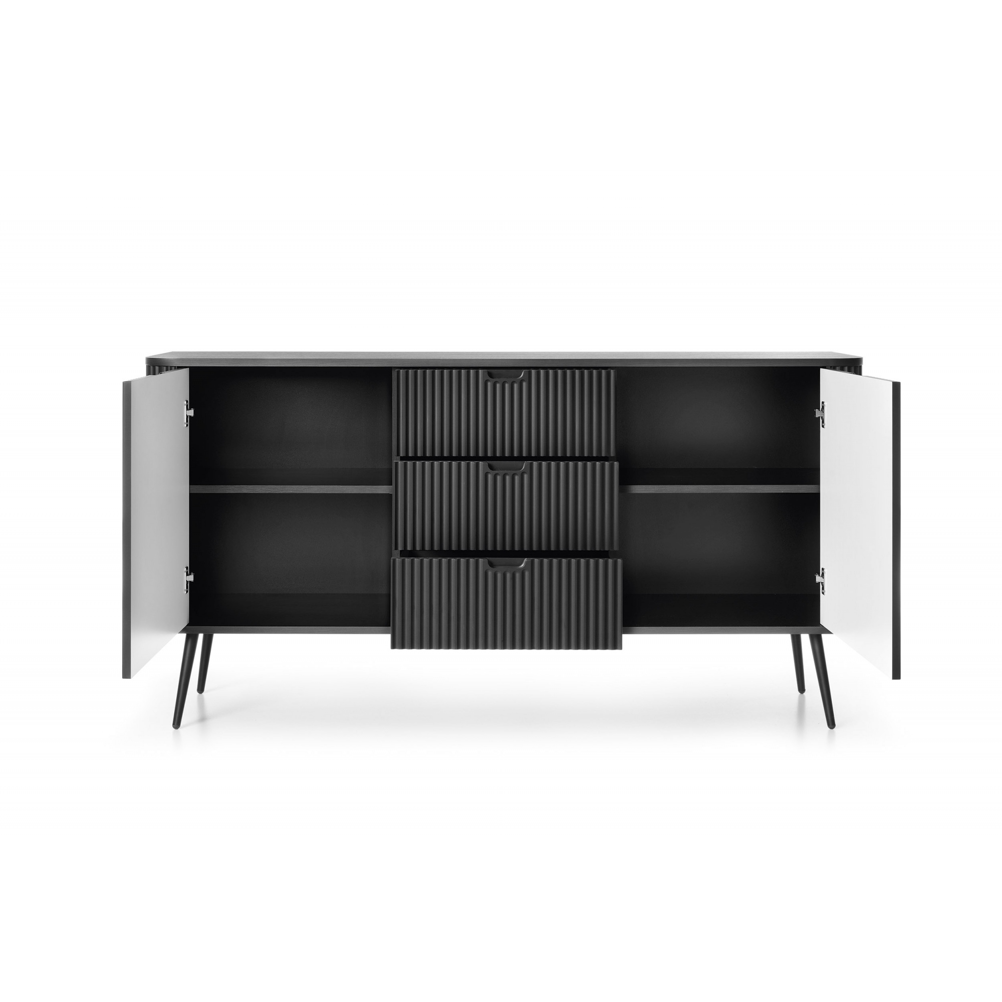 Eine moderne, geräumige Kommode mit geriffelten Fronten. Ideal für ein Schlafzimmer oder ein Wohnzimmer. Die Farbe der Kommode in Kombination mit der dekorativen 3D-MDF-Front ergibt eine moderne und minimalistische Kombination, die Ihre Einrichtung erfrischt und Sie mit ihrer Funktionalität begeistert. Drei geräumige Schubladen und zwei Einlegeböden, die sich hinter massiven Türen verbergen. Hochwertige Verarbeitung und massive Fronten aus MDF sind eine Wahl für viele Jahre. Hohe Metallbeine betonen die schlanke Form des Möbels. Gönnen Sie sich ein Wohnzimmer wie auf dem Cover der besten Zeitschriften.