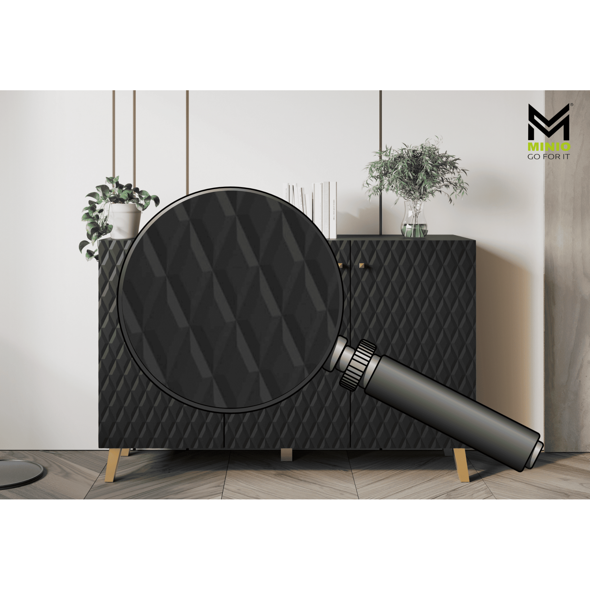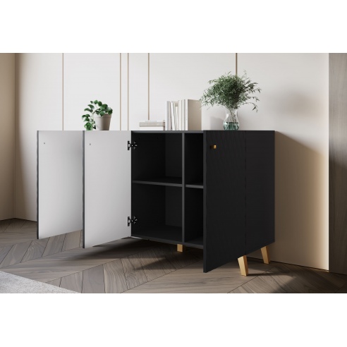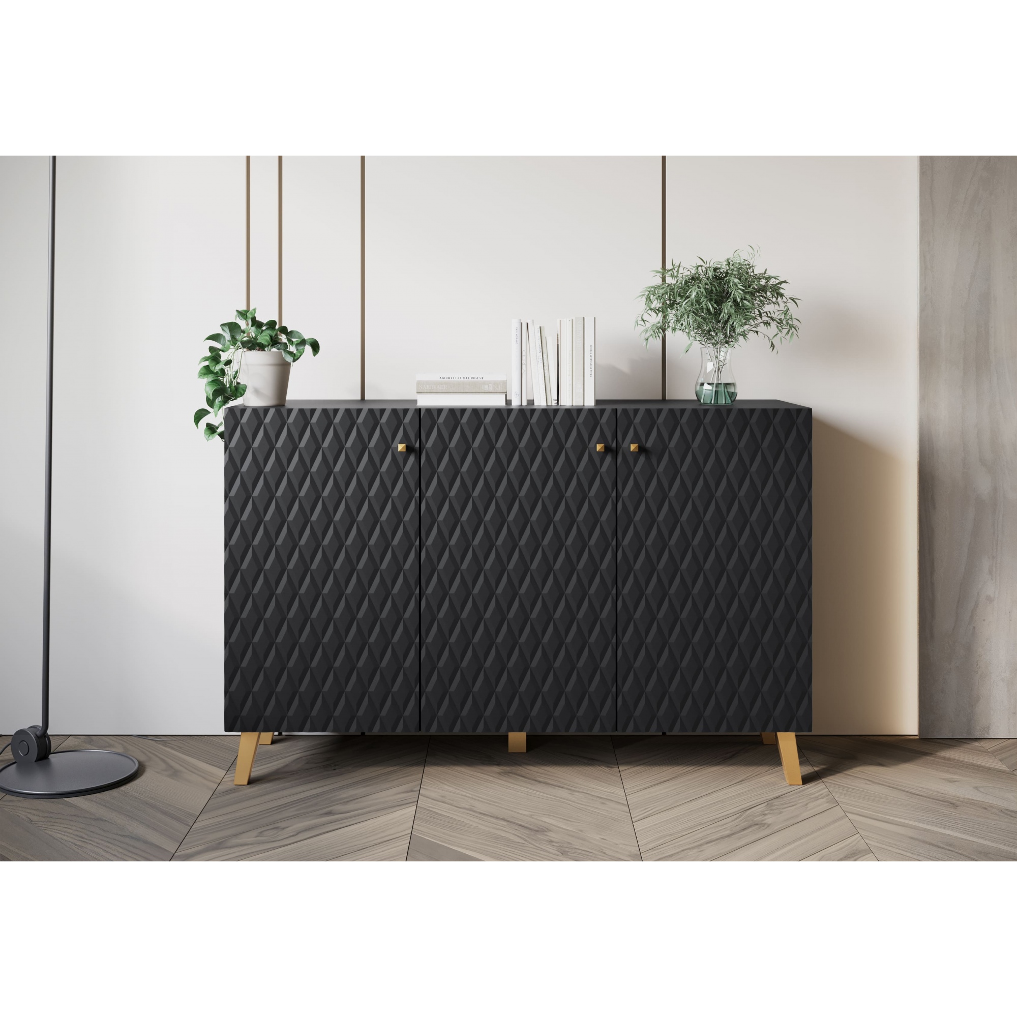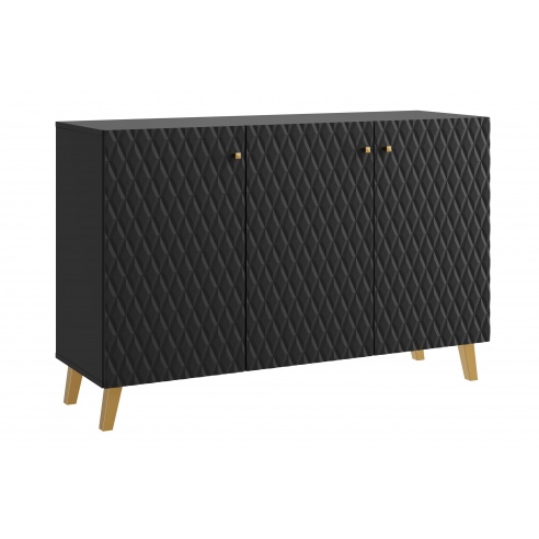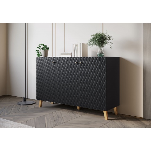 Eine moderne Kommode mit gefrästen MDF-Fronten mit Rautenmuster, die jedem Raum eine schicke Note verleihen wird. Das Möbelstück ist aus einer hochwertigen laminierten Platte in Schwarz gefertigt. Die Kommode mit Beinen ist mit drei Türen ausgestattet, hinter denen sich geräumige, durch Einlegeböden unterteilte Nischen befinden. Dank ihnen wird alles gut organisiert und leicht zugänglich sein. Die Kommode fällt zweifellos durch ihren einzigartigen Stil ins Auge. Ein Element, das ins Auge sticht, ist das elegante Design der Fronten sowie die goldfarbenen Griffe und Grifflöcher. Die breite Oberseite der Kommode kann als Platz für Ornamente oder andere Dekorationen dienen und verleiht Ihrer Einrichtung noch mehr Charme. |