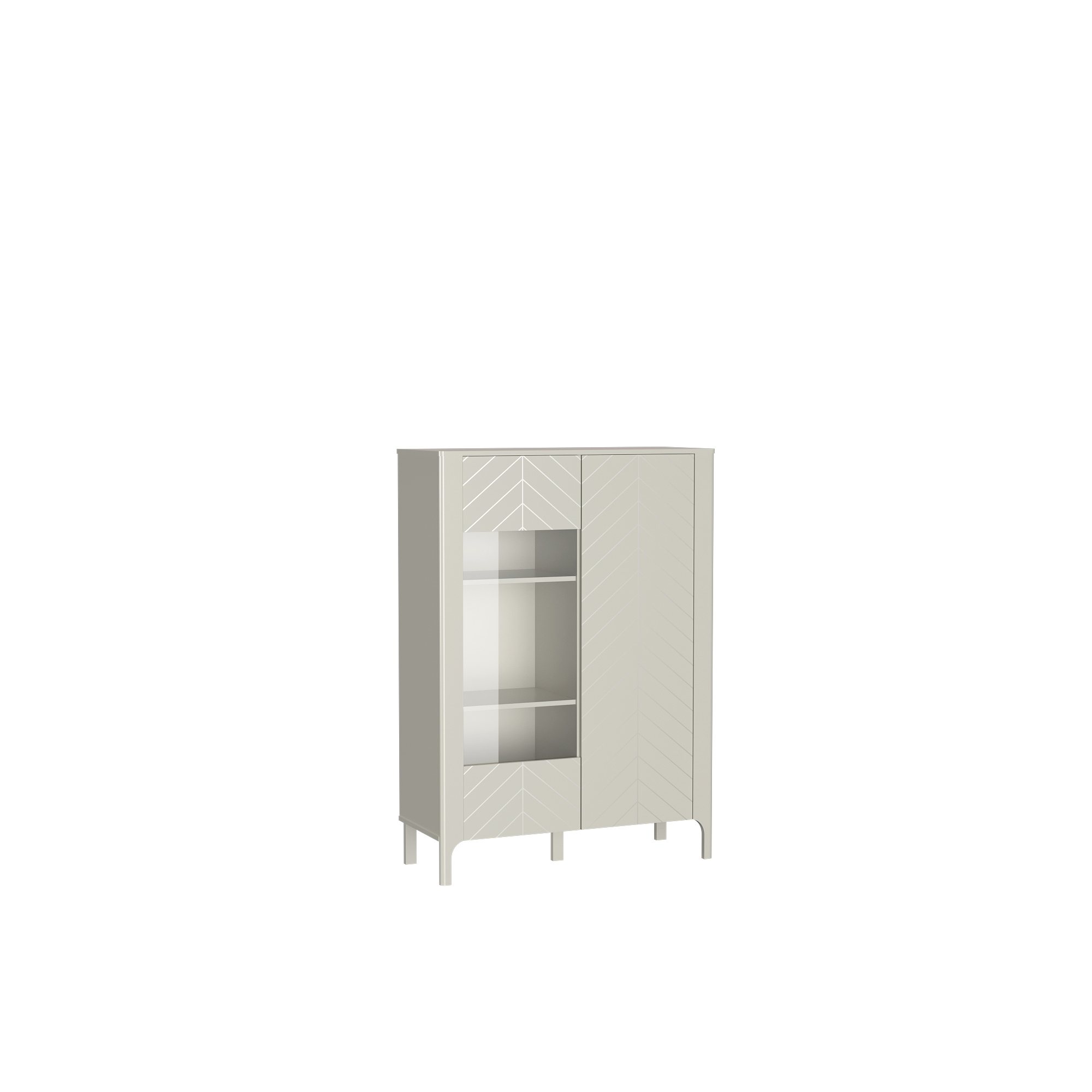Die Anrichte ist mit geräumigen Regalen ausgestattet, die Platz für die Aufbewahrung bieten, und die Glastür ermöglicht es, dekorative Elemente oder Geschirr auszustellen.