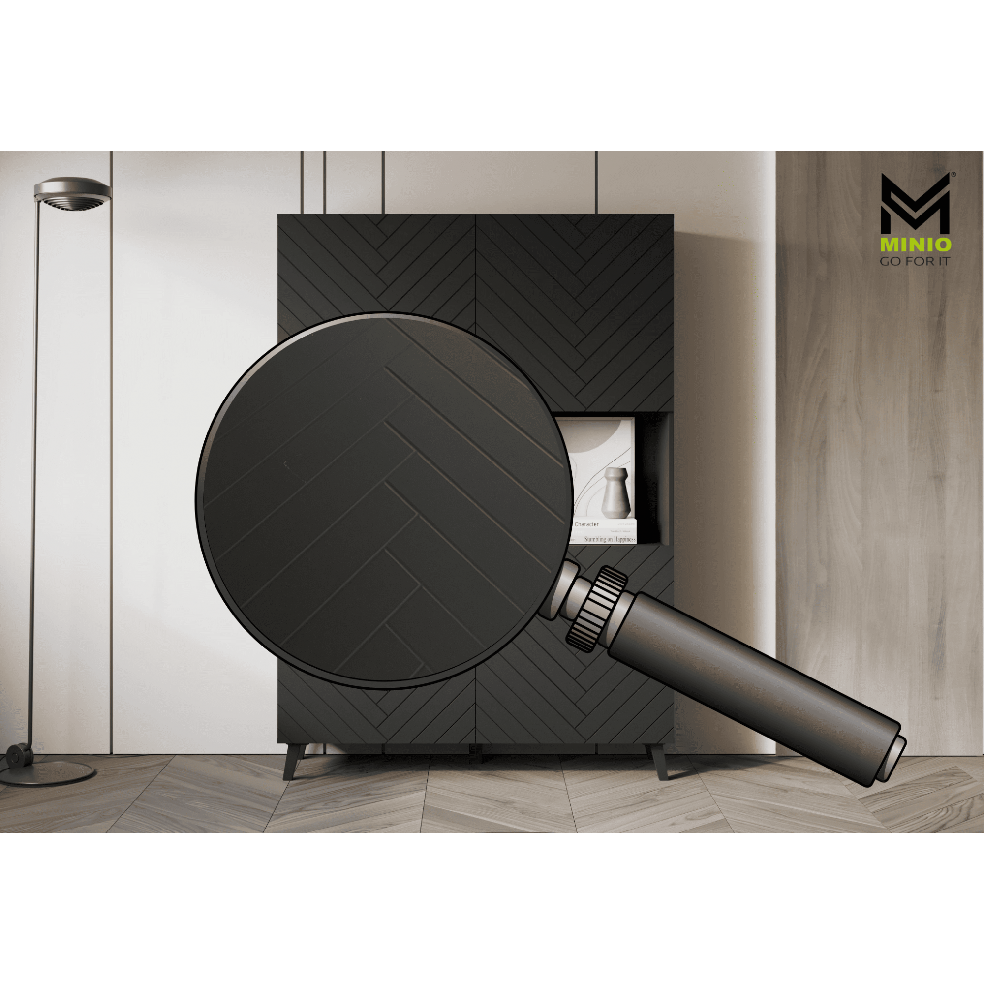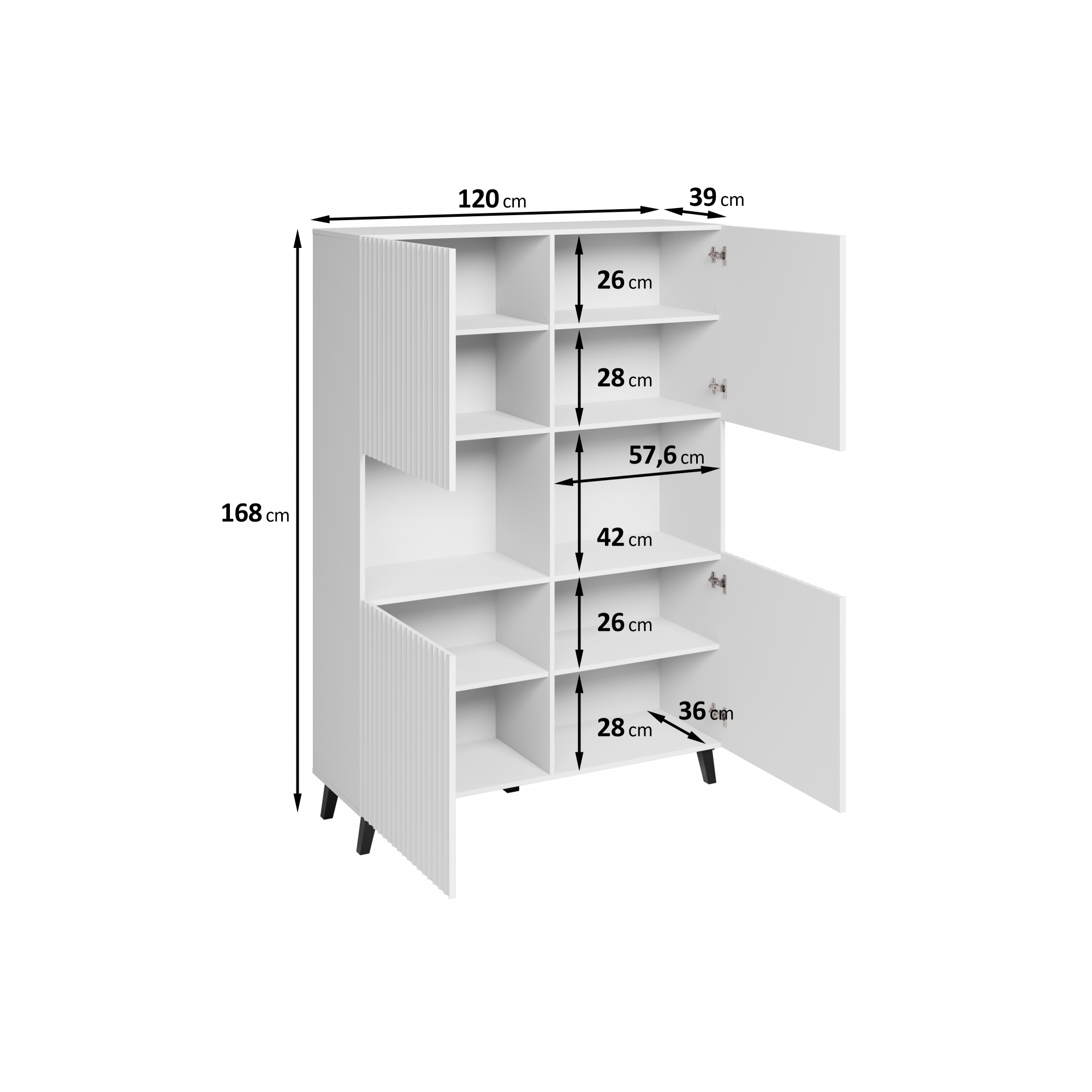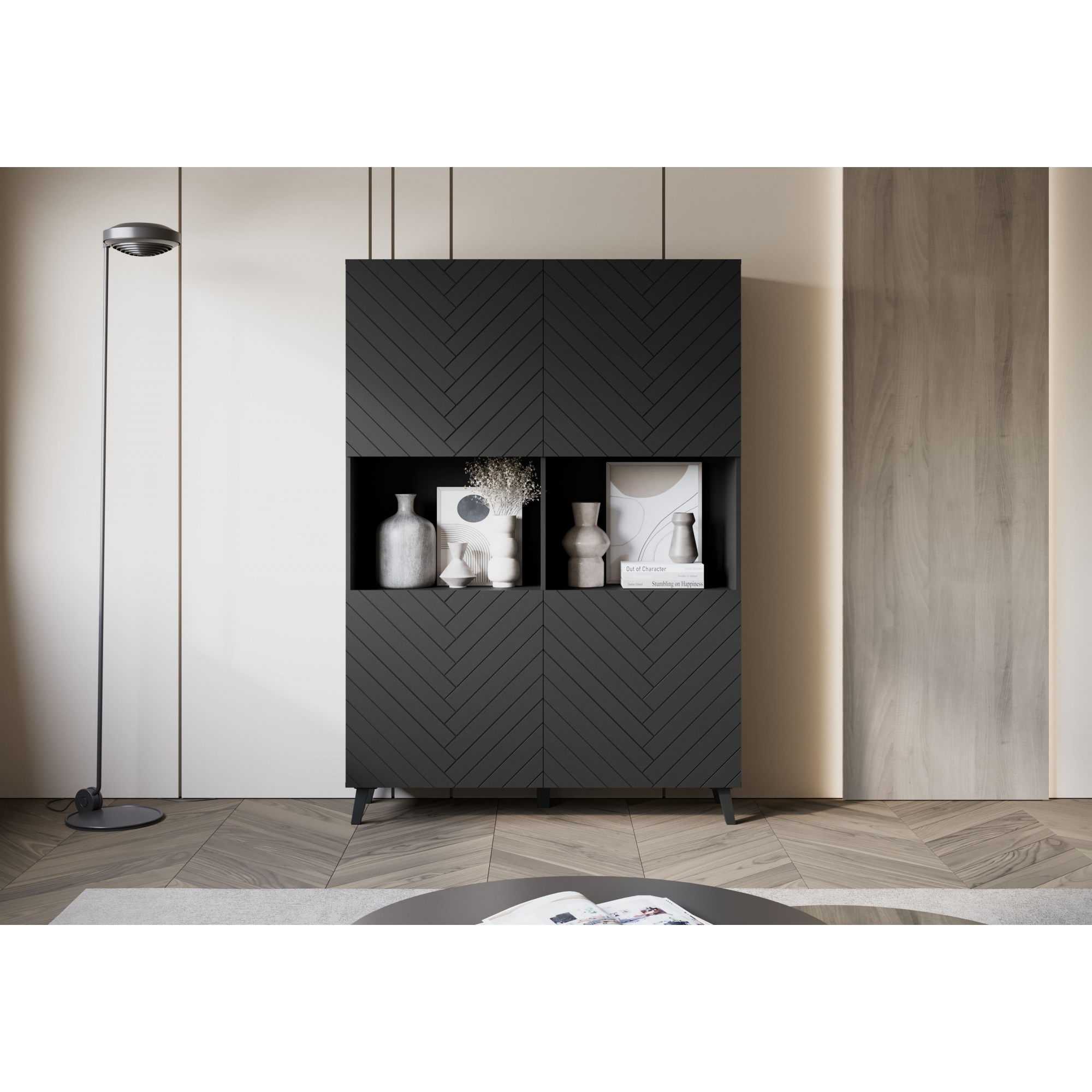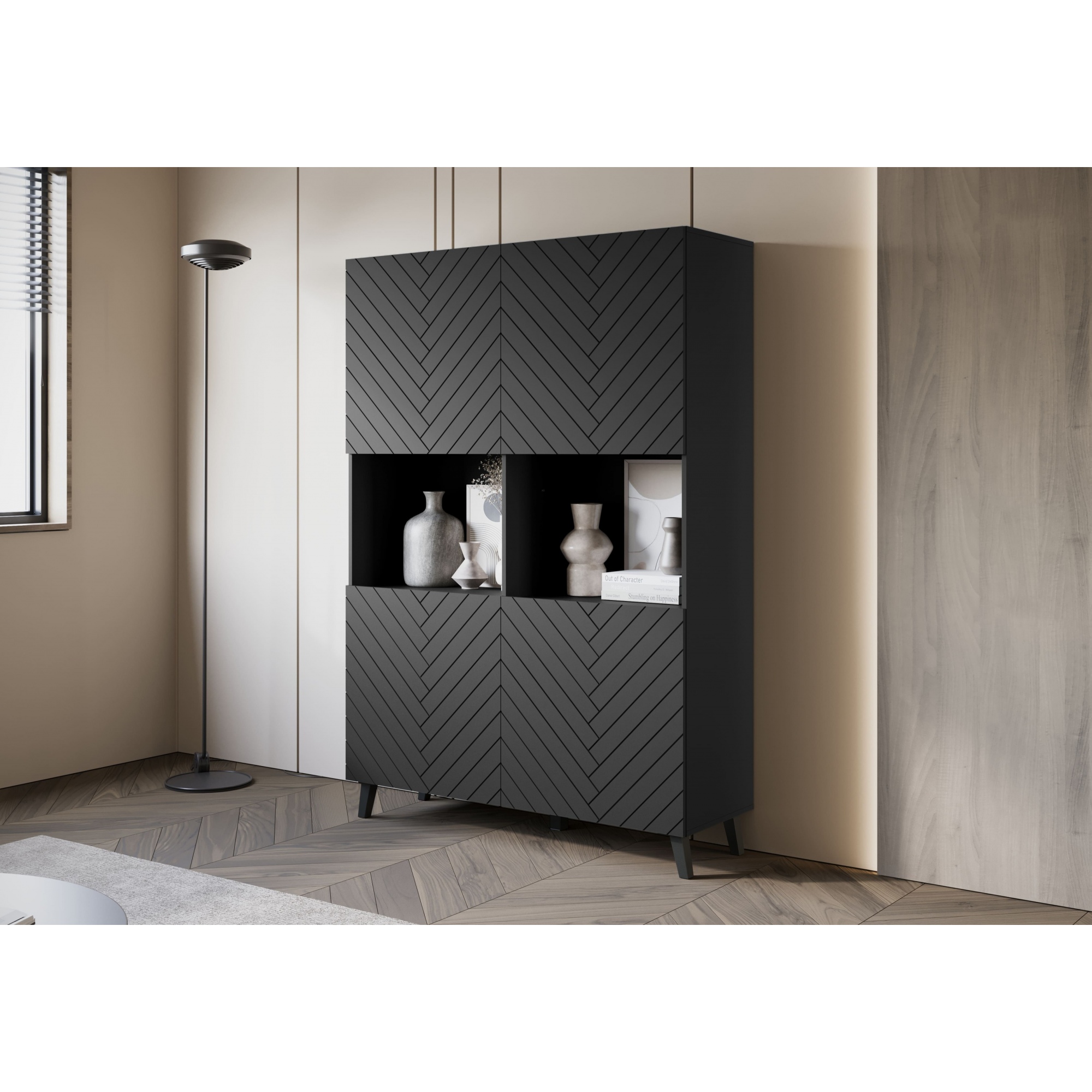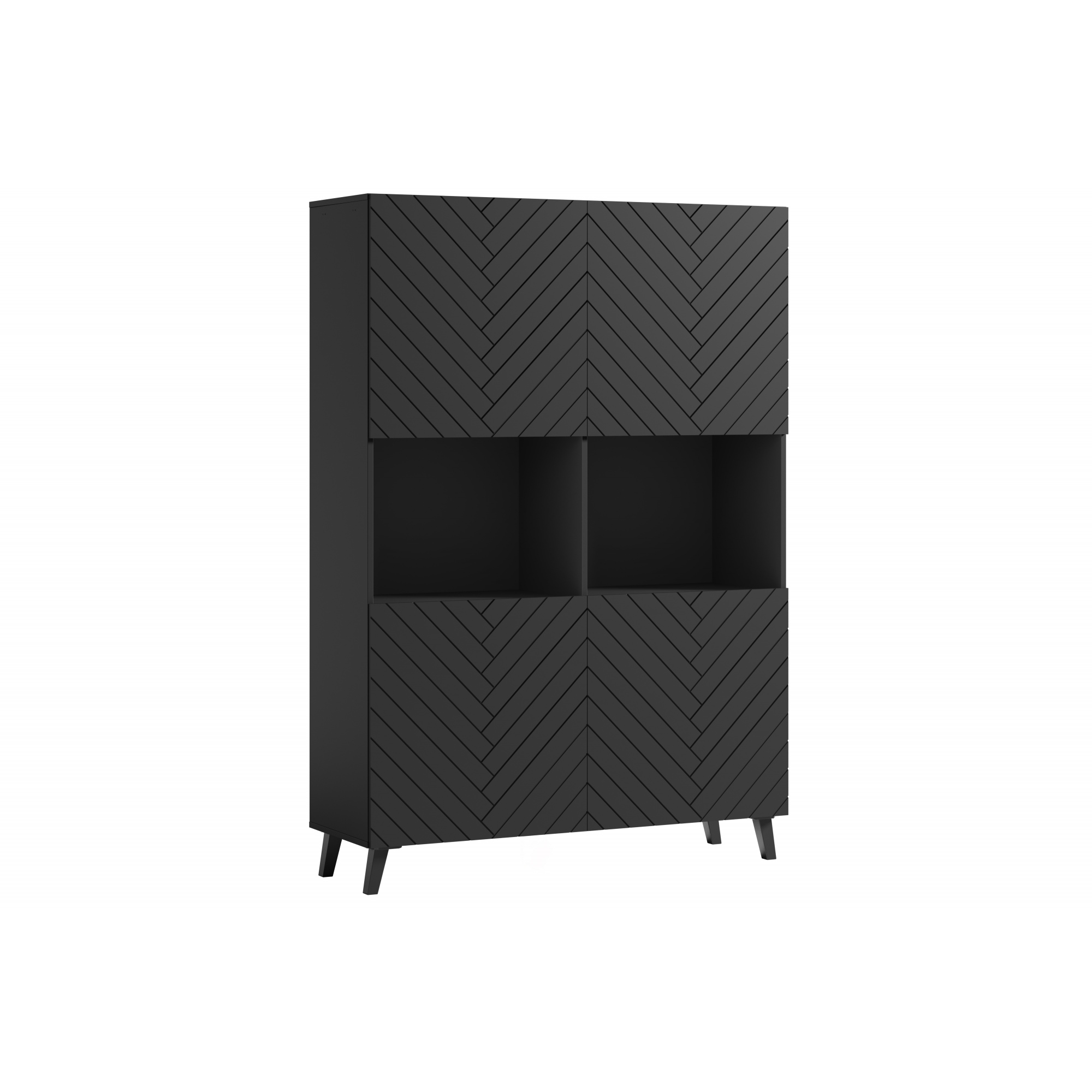 Eine moderne Vitrine mit gefrästen MDF-Fronten, die jedem Raum eine schicke Note verleiht. Das Möbelstück ist aus hochwertiger laminierter Platte in zwei Farben und Mustern erhältlich. Die Vitrine mit Beinen ist mit zwei offenen Nischen und vier Türen ausgestattet, hinter denen sich geräumige, durch Einlegeböden unterteilte Nischen befinden. So bleibt alles gut organisiert und leicht zugänglich. Die Kommode fällt zweifellos durch ihren einzigartigen Stil ins Auge. Ein Element, das die Blicke auf sich zieht, ist die elegante 3D-Musterung der Fronten. In den offenen Nischen der Vitrine können Ornamente oder andere Dekorationen aufbewahrt werden, was Ihrer Einrichtung noch mehr Charme verleiht. |