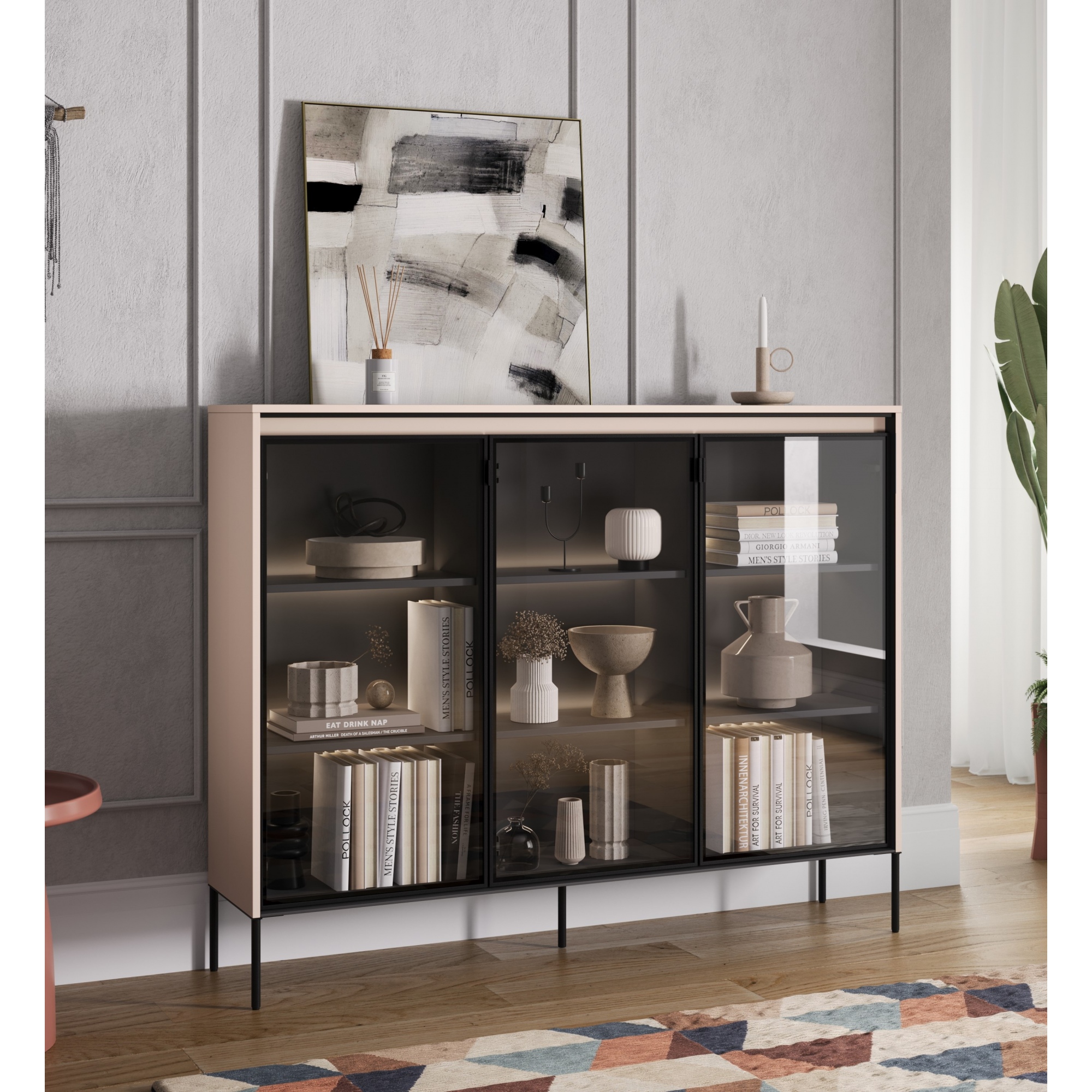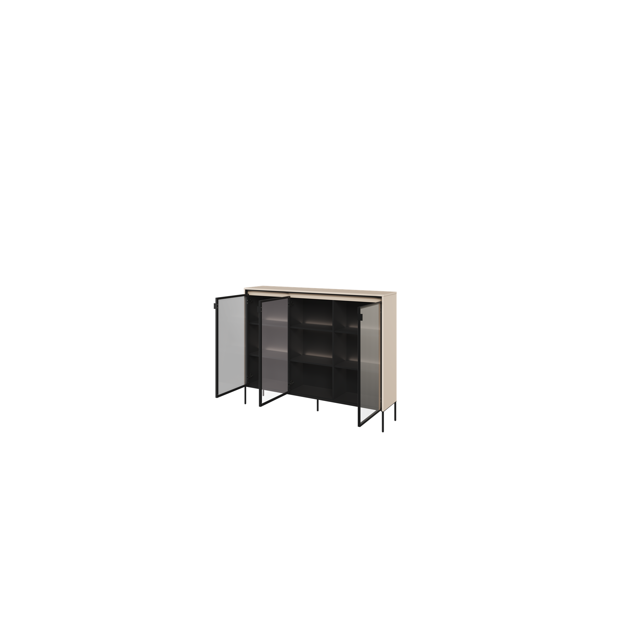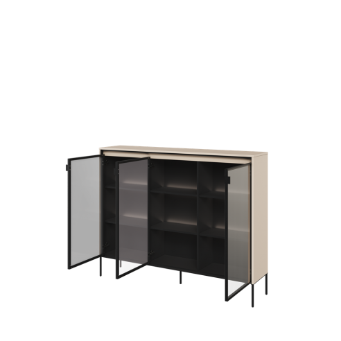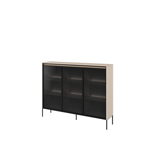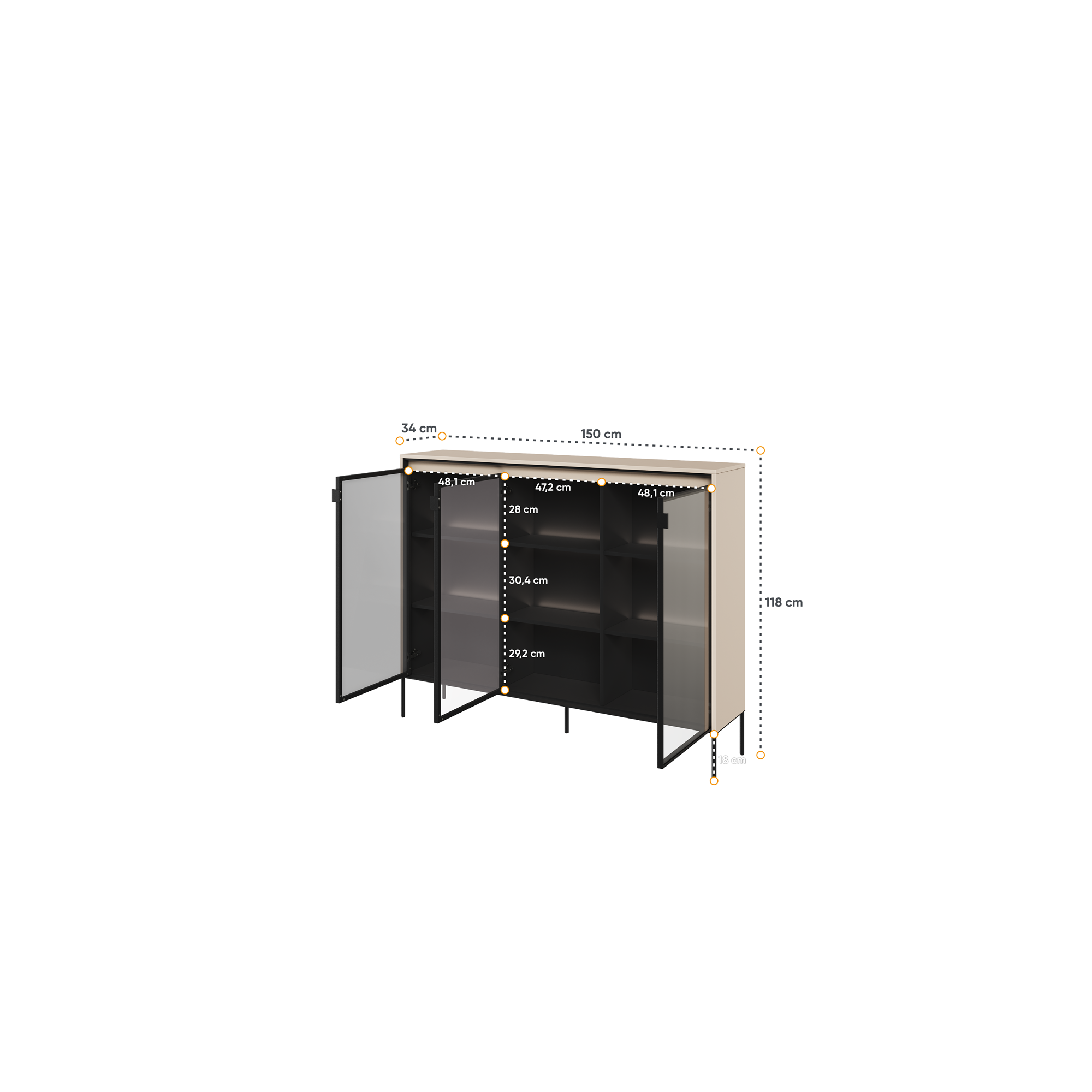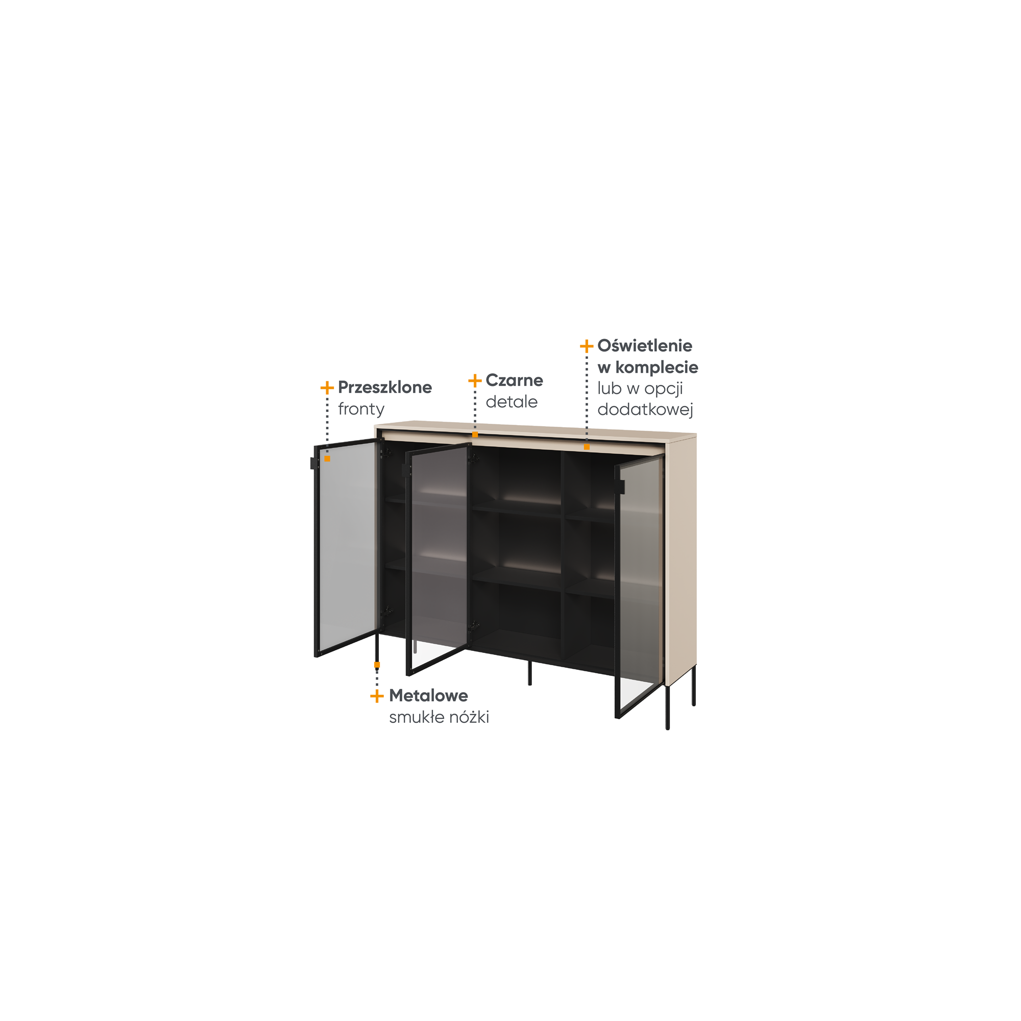 Die verglaste Kommode ist nicht nur ein Stauraum, sondern auch ein einzigartiges Möbelstück, das schon beim Betreten der Wohnung ins Auge fällt. Die Glastür gibt Ihnen die Möglichkeit, all die Dinge zu präsentieren, die Sie ausstellen möchten. Das können nicht nur Souvenirs sein, sondern auch Fotos und sogar Bücher. Die Kommode wurde sorgfältig aus hochwertigen Materialien gefertigt, was die Langlebigkeit und Robustheit des Möbels garantiert. Dank der mitgelieferten LED-Beleuchtung bringen Sie eine warme Atmosphäre in den Raum. Optional können Sie die Kommode auch mit einer Beleuchtung hinter den Einlegeböden ausstatten.