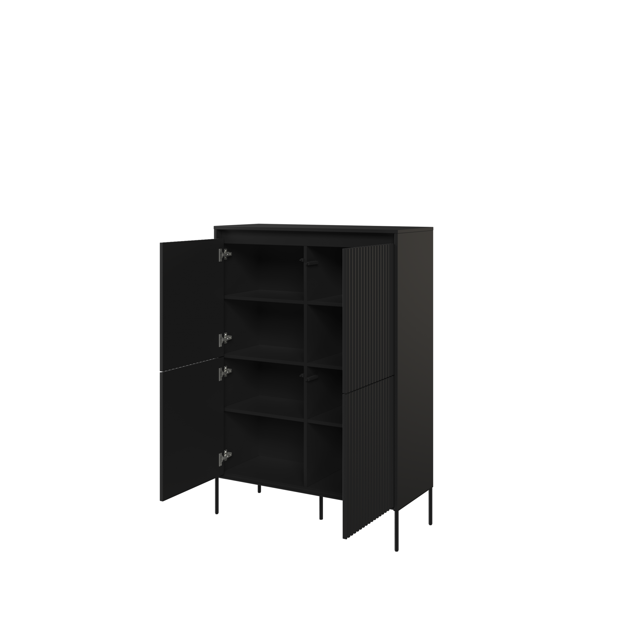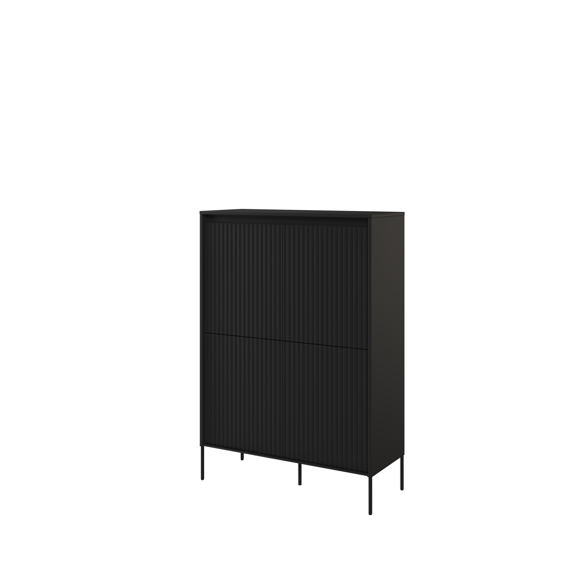Diese Kommode hat vier Türen mit einer regelmäßigen Form, die einen interessanten Akzent setzt. Eines der auffälligsten Elemente ist die elegante Riffelung der Fronten, die durch die LED-Beleuchtung noch unterstrichen wird. Die breite Oberseite der Kommode kann als Ausstellungsfläche für Ornamente oder andere Dekorationen genutzt werden und verleiht Ihrer Einrichtung noch mehr Charme. Das „push to open“-System erleichtert die Benutzung der Kommode erheblich.