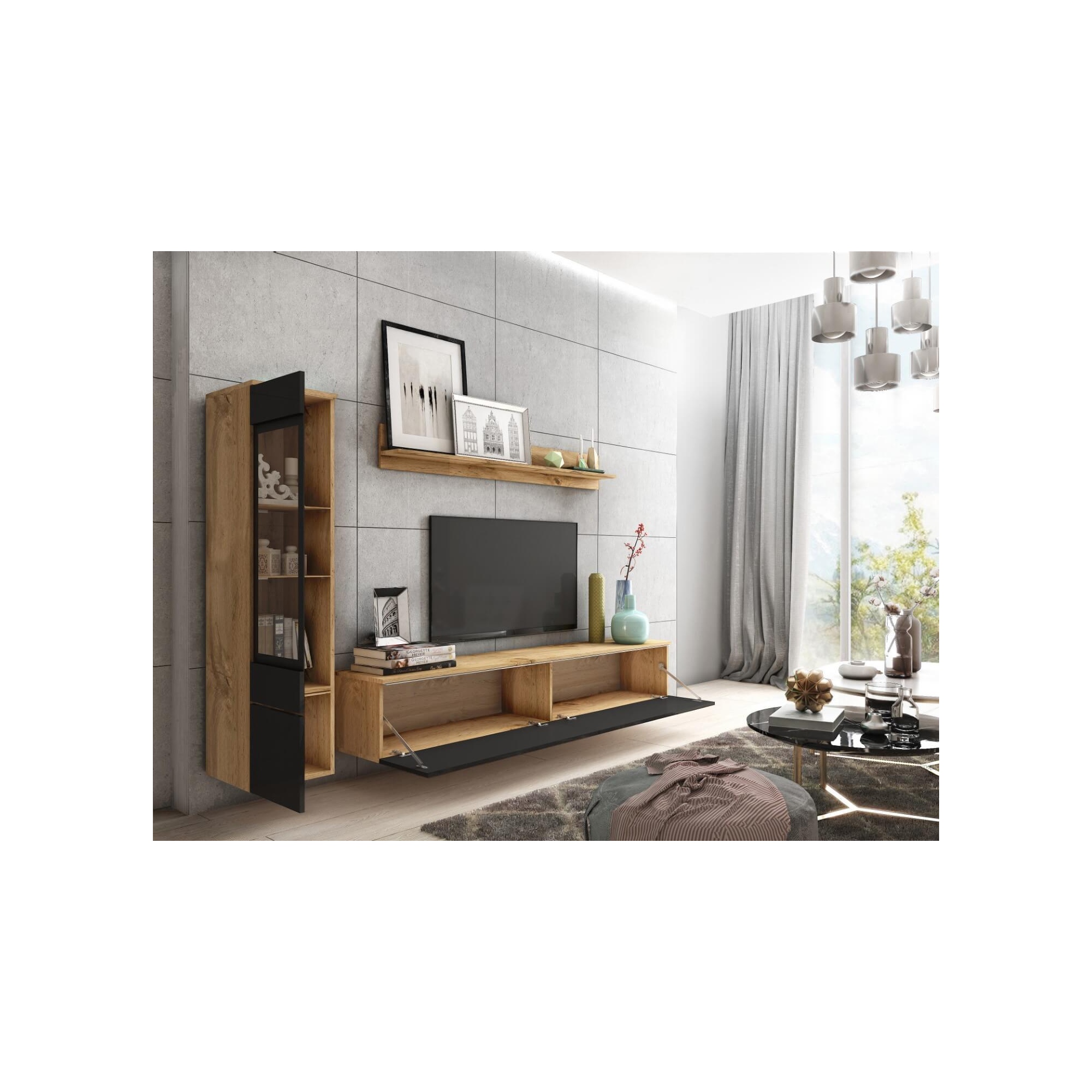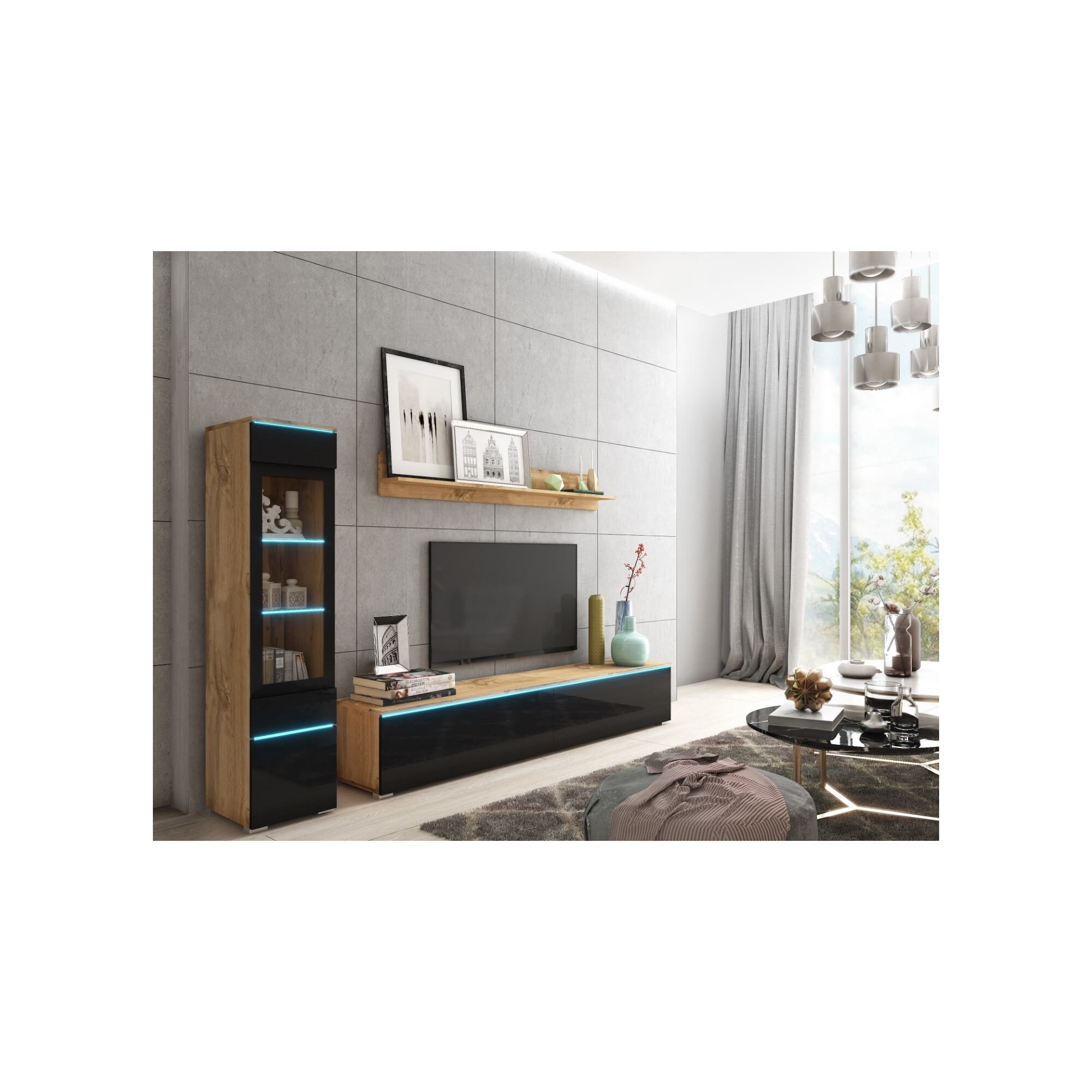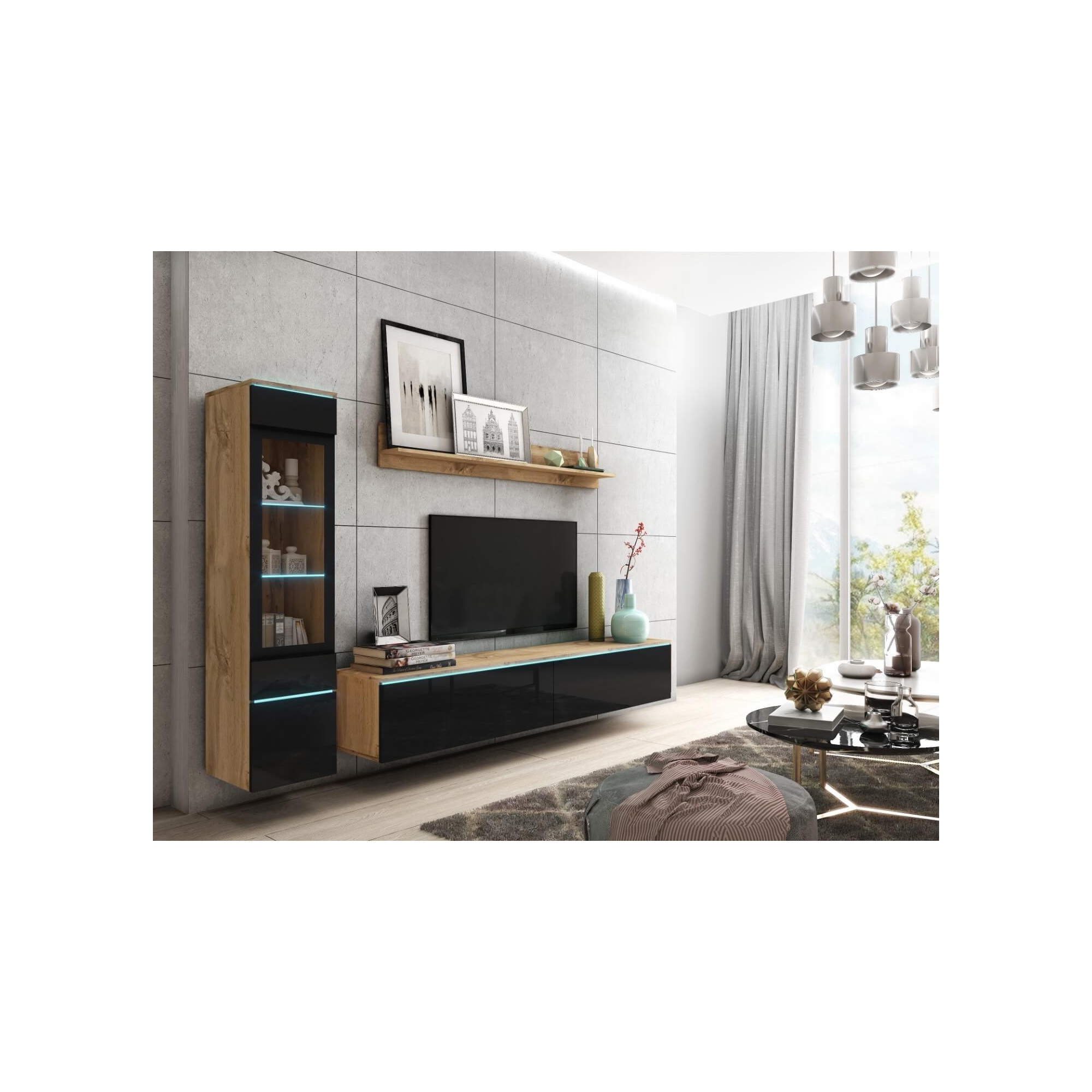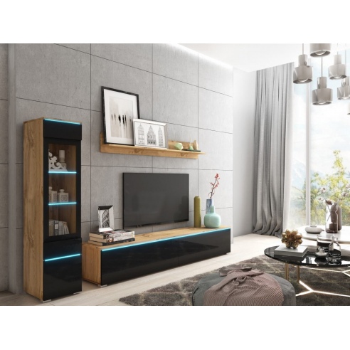 Je nach der Stimmung kann die Wohnwand hängend oder stehend sein. Der Korpus aus hochwertiger, laminierter, 15mm starker Spanplatte in der weißen Farbe gefertigt. Front im Glanz (Spanplatte Polygloss 15mm). Die gehärtete Glasscheibe teilweise bemalt.