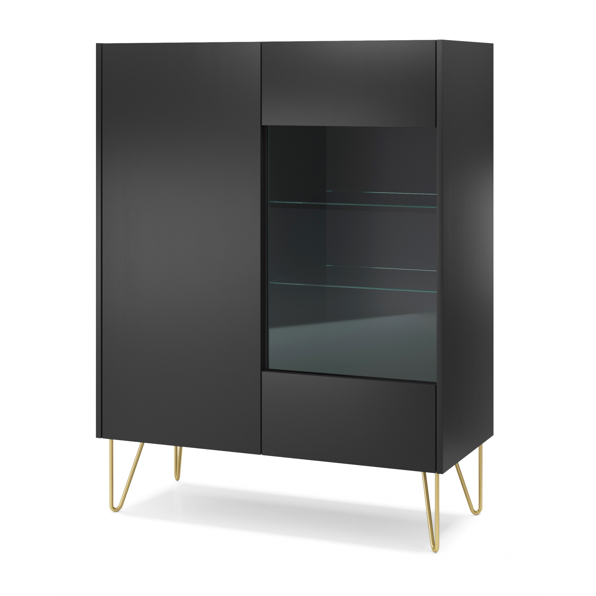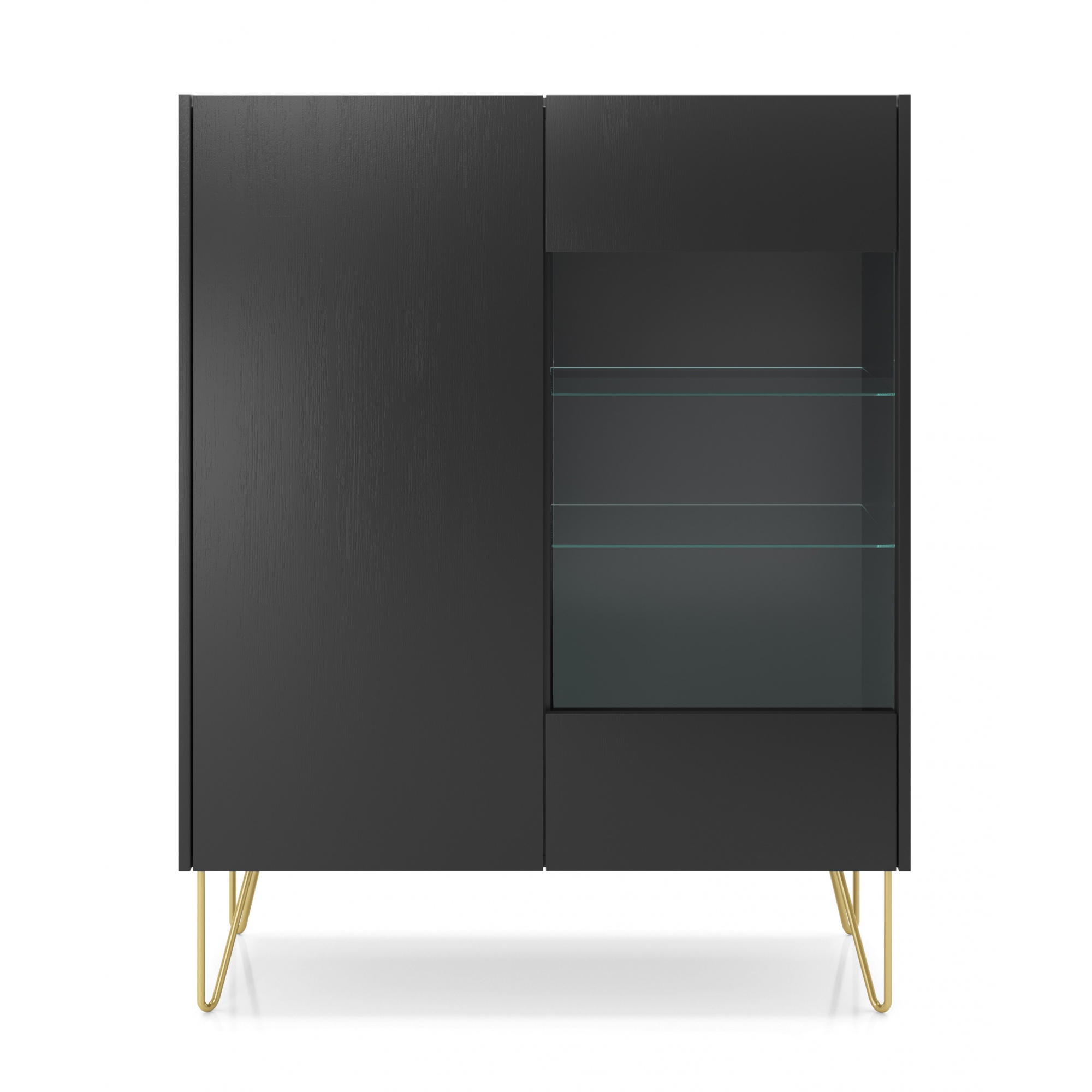 Unsere Vitrine aus der HAGA-Kollektion ist ideal für das Wohnzimmer, das Esszimmer oder auch das Schlafzimmer. Der Schrank hat zwei Türen. Vier Einlegeböden im Inneren bieten viel Stauraum. Die beiden Einlegeböden hinter den Glastüren sind verglast, so dass Sie Ihre Erinnerungsstücke und Fotos noch besser zur Geltung bringen können. Durch die Farbkombination (Graphitschwarz/Royal Marmorschwarz) passt er perfekt in jede Einrichtung. Ein zusätzlicher Pluspunkt sind die Metallbeine, die ihm einen interessanten Charakter verleihen. Aus hochwertigen Materialien gefertigt, wird Ihnen dieses Möbelstück viele Jahre lang Freude bereiten.